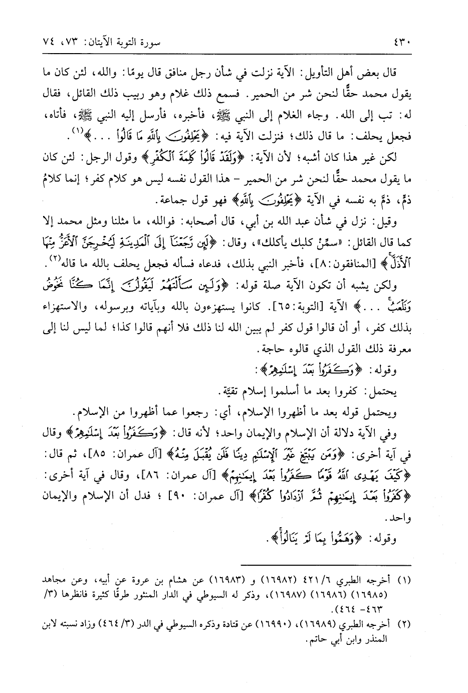 لكن غير هذا كان أشبه؛ لأن الآية: (وَلَقَدْ قَالُوا كَلِمَةَ الْكُفْرِ) وقول الرجل: لئن كان ما يقول مُحَمَّد حقا لنحن شر من الحمير - هذا القول نفسه ليس هو كلام كفر؛ إنما كلامُ ذم، ذمَّ به نفسه في الآية (يَحْلِفُونَ بِاللَّهِ) وفهو قول جماعة.
