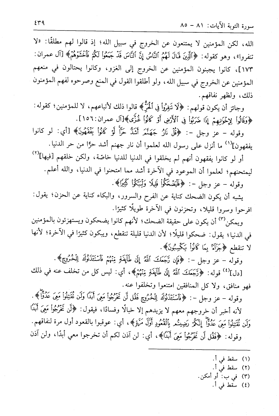 اللَّه، لكن المؤمنين لا يمتنعون عن الخروج في سبيل اللَّه؛ إذ قالوا لهم مطلقًا: " لا تنفروا "، وهو كقوله: (الَّذِينَ قَالَ لَهُمُ النَّاسُ إِنَّ النَّاسَ قَدْ جَمَعُوا لَكُمْ فَاخْشَوْهُمْ) كانوا يجبنون المؤمنين عن الخروج إلى الغزو، وكانوا يحتالون في منعهم المؤمنين عن الخروج في سبيل اللَّه، ولو أطلقوا القول في المنع وصرحوه لفهم المؤمنون ذلك، ولظهر نفاقهم.