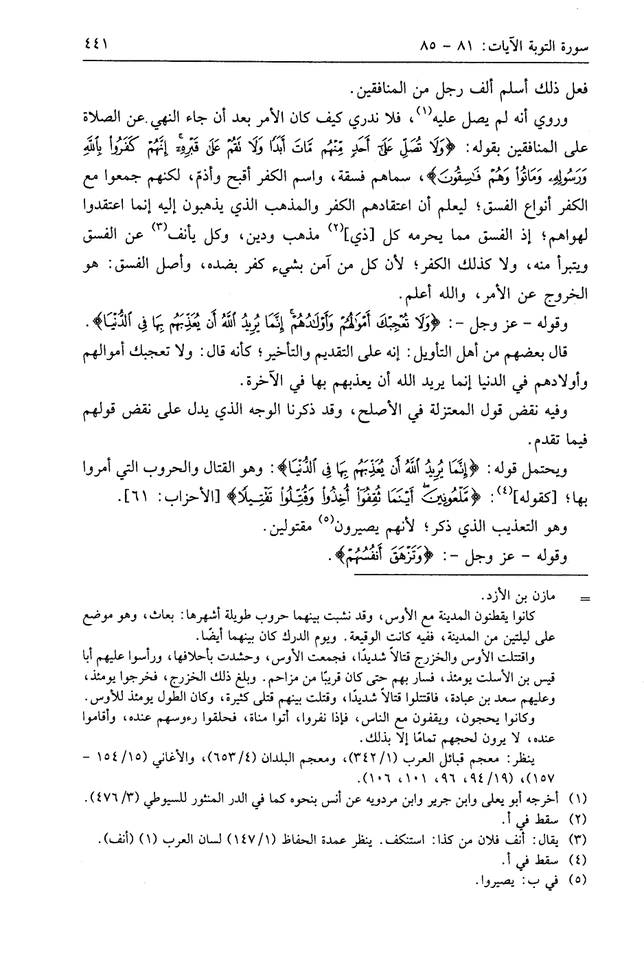 وروي أنه لم يصل عليه، فلا ندري كيف كان الأمر بعد أن جاء النهي. عن الصلاة على المنافقمن بقوله: (وَلَا تُصَلِّ عَلَى أَحَدٍ مِنْهُمْ مَاتَ أَبَدًا وَلَا تَقُمْ عَلَى قَبْرِهِ إِنَّهُمْ كَفَرُوا بِاللَّهِ وَرَسُولِهِ وَمَاتُوا وَهُمْ فَاسِقُونَ)، سماهم فسقة، واسم الكفر أقبح وأذم، لكنهم جمعوا مع الكفر أنواع الفسق؛ ليعلم أن اعتقادهم الكفر والمذهب الذي يذهبون إليه إنما اعتقدوا لهواهم؛ إذ الفسق مما يحرمه كل أذي، مذهب ودين، وكل يأنف عن الفسق ويتبرأ منه، ولا كذلك الكفر؛ لأن كل من آمن بشيء كفر بضده، وأصل الفسق: هو الخروج عن الأمر، واللَّه أعلم.