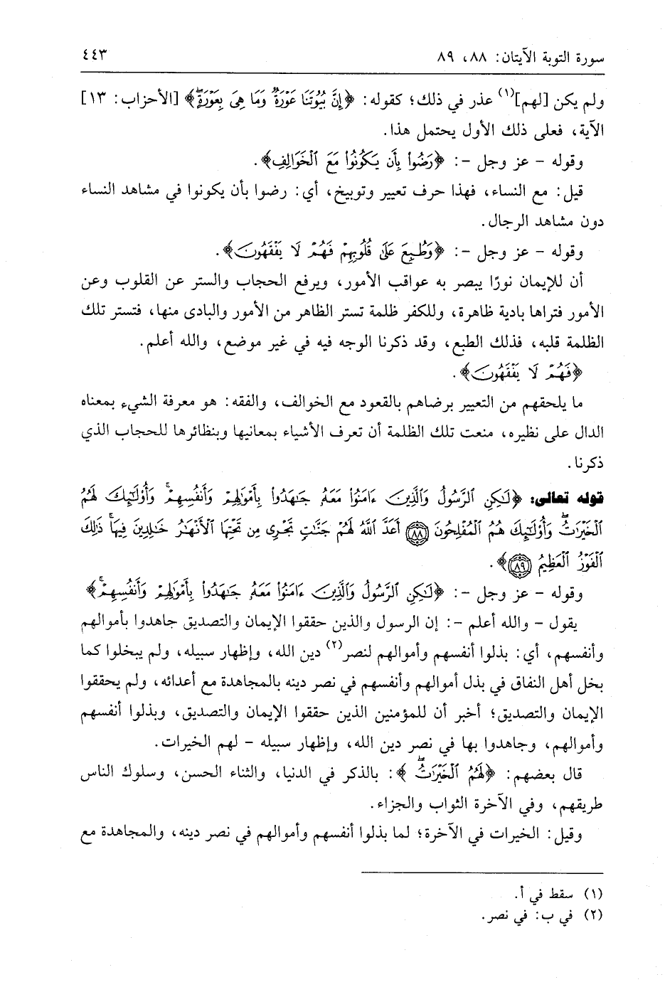 يقول - واللَّه أعلم -: إن الرسول والذين حققوا الإيمان والتصديق جاهدوا بأموالهم وأنفسهم، أي: بذلوا أنفسهم وأموالهم لنصر دين اللَّه، وإظهار سبيله، ولم يبخلوا كما بخل أهل النفاق في بذل أموالهم وأنفسهم في نصر دينه بالمجاهدة مع أعدائه، ولم يحققوا الإيمان والتصديق؛ أخبر أن للمؤمنين الذين حققوا الإيمان والتصديق، وبذلوا أنفسهم وأموالهم، وجاهدوا بها في نصر دين اللَّه، وإظهار سبيله - لهم الخيرات.