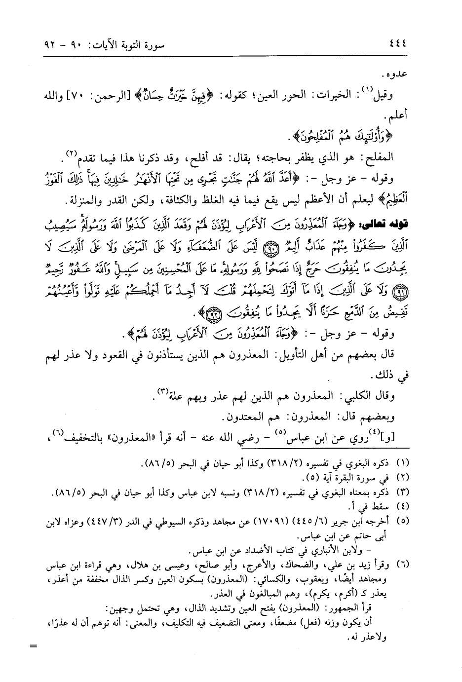 قوله تعالى: (وَجَاءَ الْمُعَذِّرُونَ مِنَ الْأَعْرَابِ لِيُؤْذَنَ لَهُمْ وَقَعَدَ الَّذِينَ كَذَبُوا اللَّهَ وَرَسُولَهُ سَيُصِيبُ الَّذِينَ كَفَرُوا مِنْهُمْ عَذَابٌ أَلِيمٌ (90) لَيْسَ عَلَى الضُّعَفَاءِ وَلَا عَلَى الْمَرْضَى وَلَا عَلَى الَّذِينَ لَا يَجِدُونَ مَا يُنْفِقُونَ حَرَجٌ إِذَا نَصَحُوا لِلَّهِ وَرَسُولِهِ مَا عَلَى الْمُحْسِنِينَ مِنْ سَبِيلٍ وَاللَّهُ غَفُورٌ رَحِيمٌ (91) وَلَا عَلَى الَّذِينَ إِذَا مَا أَتَوْكَ لِتَحْمِلَهُمْ قُلْتَ لَا أَجِدُ مَا أَحْمِلُكُمْ عَلَيْهِ تَوَلَّوْا وَأَعْيُنُهُمْ تَفِيضُ مِنَ الدَّمْعِ حَزَنًا أَلَّا يَجِدُوا مَا يُنْفِقُونَ (92)