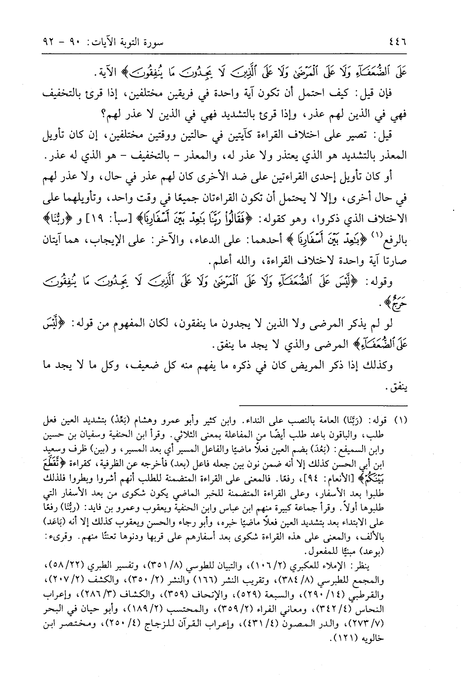 فَإِنْ قِيلَ: كيف احتمل أن تكون آية واحدة في فريقين مختلفين، إذا قرئ بالتخفيف فهي في الذين لهم عذر، وإذا قرئ بالتشديد فهي في الذين لا عذر لهم؟