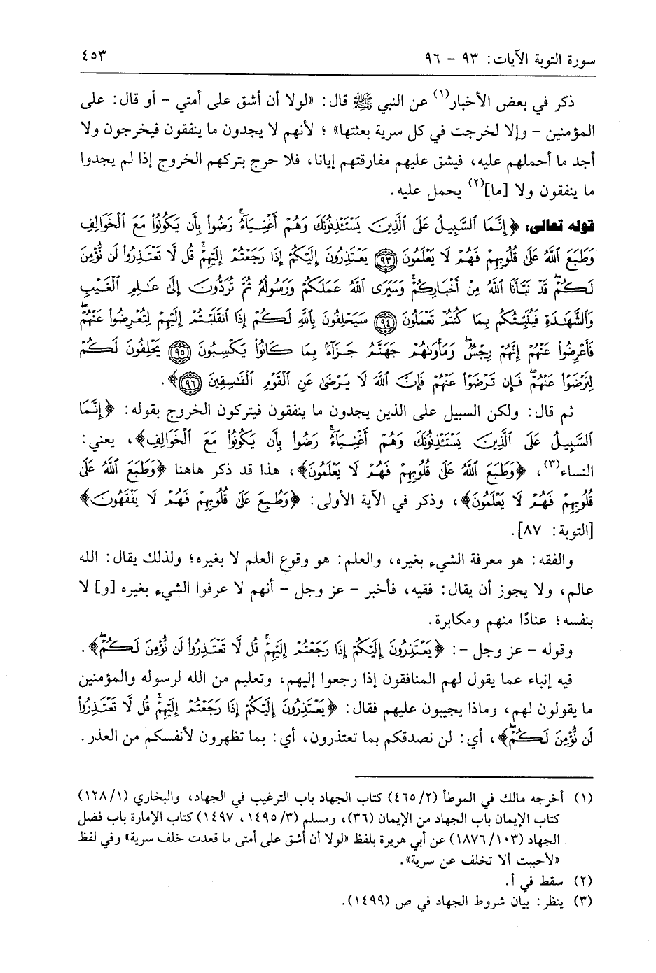 ثم قال: ولكن السبيل على الذين يجدون ما ينفقون فيتركون الخروج بقوله: (إِنَّمَا السَّبِيلُ عَلَى الَّذِينَ يَسْتَأْذِنُونَكَ وَهُمْ أَغْنِيَاءُ رَضُوا بِأَنْ يَكُونُوا مَعَ الْخَوَالِفِ)، يعني: النساء، (وَطَبَعَ اللَّهُ عَلَى قُلُوبِهِمْ فَهُمْ لَا يَعْلَمُونَ)، هذا قد ذكر هاهنا (وَطَبَعَ اللَّهُ عَلَى قُلُوبِهِمْ فَهُمْ لَا يَعْلَمُونَ)، وذكر في الآية الأولى: (وَطُبِعَ عَلَى قُلُوبِهِمْ فَهُمْ لَا يَفْقَهُونَ).