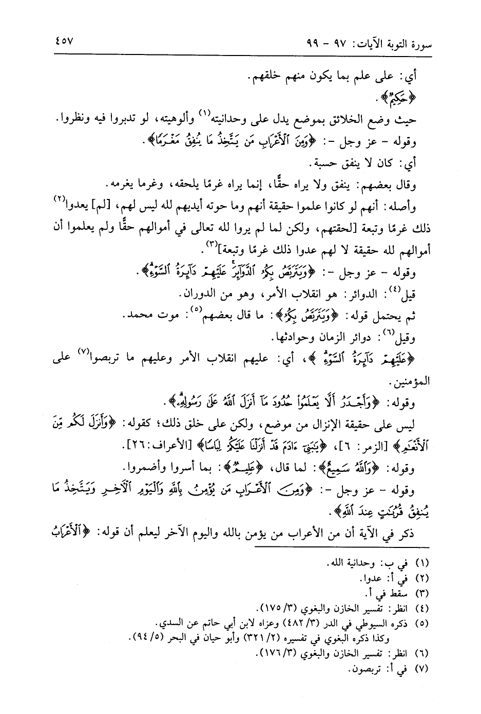 وقوله - عَزَّ وَجَلَّ -: (وَمِنَ الْأَعْرَابِ مَنْ يَتَّخِذُ مَا يُنْفِقُ مَغْرَمًا وَيَتَرَبَّصُ بِكُمُ الدَّوَائِرَ عَلَيْهِمْ دَائِرَةُ السَّوْءِ وَاللَّهُ سَمِيعٌ عَلِيمٌ (98)
