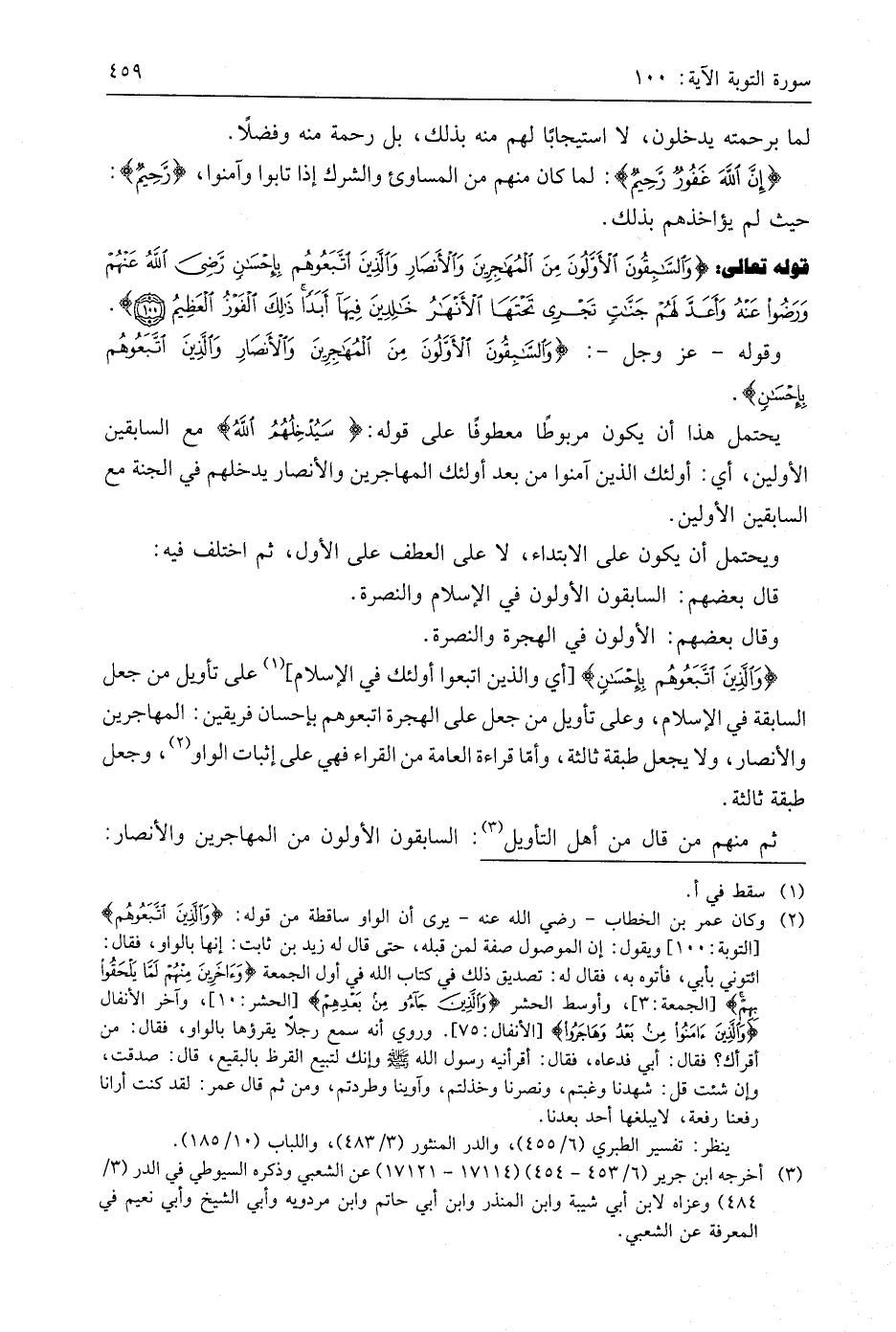 قوله تعالى: (وَالسَّابِقُونَ الْأَوَّلُونَ مِنَ الْمُهَاجِرِينَ وَالْأَنْصَارِ وَالَّذِينَ اتَّبَعُوهُمْ بِإِحْسَانٍ رَضِيَ اللَّهُ عَنْهُمْ وَرَضُوا عَنْهُ وَأَعَدَّ لَهُمْ جَنَّاتٍ تَجْرِي تَحْتَهَا الْأَنْهَارُ خَالِدِينَ فِيهَا أَبَدًا ذَلِكَ الْفَوْزُ الْعَظِيمُ (100)
