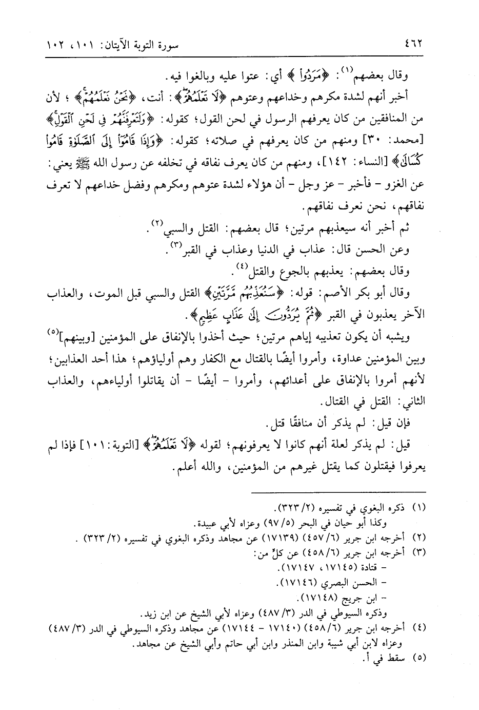 ويشبه أن يكون تعذيبه إياهم مرتين؛ حيث أخذوا بالإنفاق على المؤمنين وبينهم وبين المؤمنين عداوة، وأمروا أيضًا بالقتال مع الكفار وهم أولياؤهم؛ هذا أحد العذابين؛ لأنهم أمروا بالإنفاق على أعدائهم، وأمروا -أيضًا- أن يقاتلوا أولياءهم، والعذاب الثاني: القتل في القتال.