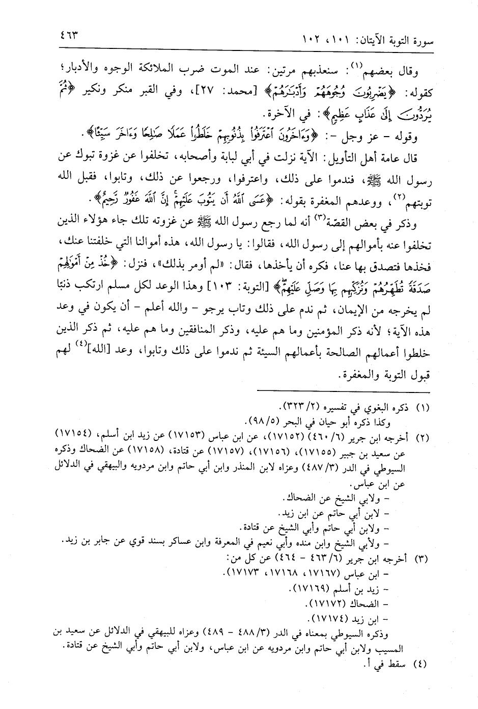 وذكر في بعض القصّة أنه لما رجع رسول اللَّه - صَلَّى اللَّهُ عَلَيهِ وَسَلَّمَ - عن غزوته تلك جاء هَؤُلَاءِ الذين تخلفوا عنه بأموالهم إلى رسول اللَّه، فقالوا: يا رسول اللَّه، هذه أموالنا التي خلفتنا عنك، فخذها فتصدق بها عنا، فكره أن يأخذها، فقال: " لم أومر بذلك "، فنزل: (خُذْ مِنْ أَمْوَالِهِمْ صَدَقَةً تُطَهِّرُهُمْ وَتُزَكِّيهِمْ بِهَا وَصَلِّ عَلَيْهِمْ)، وهذا الوعد لكل مسلم ارتكب ذنبًا لم يخرجه من الإيمان، ثم ندم على ذلك وتاب يرجو - واللَّه أعلم - أن يكون في وعد هذه الآية؛ لأنه ذكر المؤمنين وما هم عليه، وذكر المنافقين وما هم عليه، ثم ذكر الذين خلطوا أعمالهم الصالحة بأعمالهم السيئة ثم ندموا على ذلك وتابوا، وعد اللَّه لهم قبول التوبة والمغفرة.