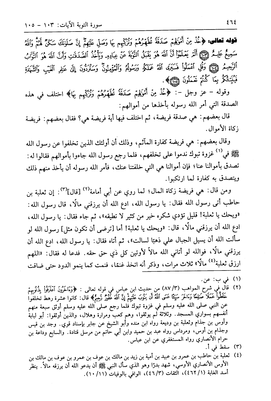 ومن قال: هي فريضة زكاة المال؛ لما روي عن أبي أمامة قال: إن ثعلبة بن حاطب أتى رسول اللَّه فقال: يا رسول اللَّه، ادع اللَّه أن يرزقني مالًا، قال رسول اللَّه: " ويحك يا ثعلبة! قليل تؤدي شكره خير من كثير لا تطيقه "، ثم جاء فقال: يا رسول اللَّه، ادع اللَّه أن يرزقني مالًا، قال: " ويحك يا ثعلبة! أما أترضى أن تكون مثل، رسول اللَّه لو سألت اللَّه أن يسيل الجبال عليَّ ذهبًا لسالت "، ثم أتاه فقال: يا رسول اللَّه، ادع اللَّه أن يرزقني مالًا، فواللَّه لو أتاني اللَّه مالًا لأوتين كل ذي حق حقه. فدعا له فقال: " اللهم ارزق ثعلبة مالًا " ثلاث مرات، وذكر أنه اتخذ غنمًا، فنمت كما ينمو الدود حتى ضاقت