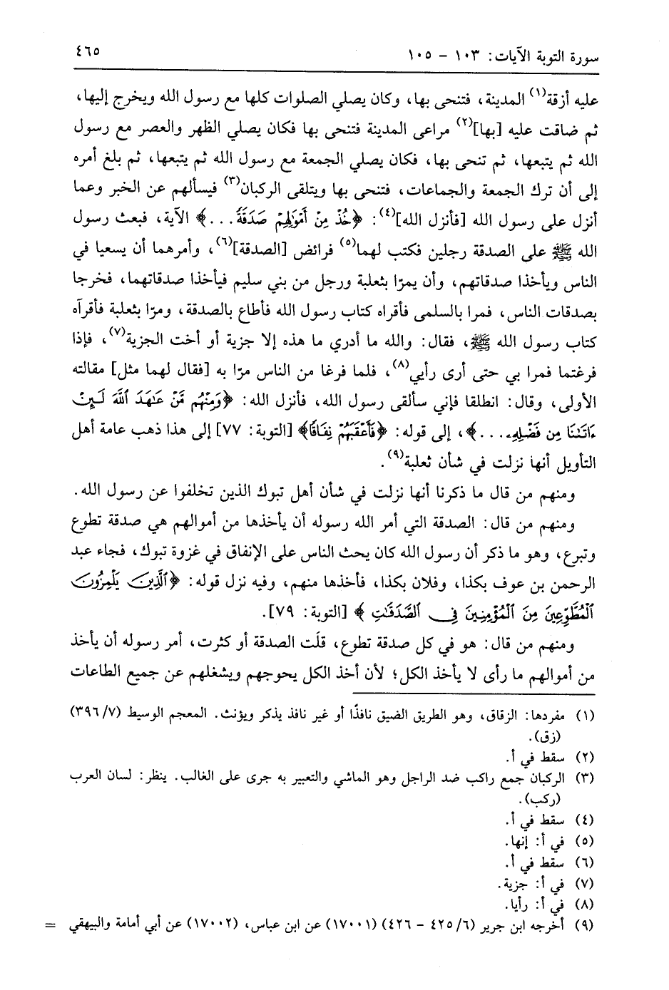 عليه أزقة المدينة، فتنحى بها، وكان يصلي الصلوات كلها مع رسول اللَّه ويخرج إليها، ثم ضاقت عليه بها مراعى المدينة فتنحى بها فكان يصلي الظهر والعصر مع رسول اللَّه ثم يتبعها، ثم تنحى بها، فكان يصلي الجمعة مع رسول اللَّه ثم يتبعها، ثم بلغ أمره إلى أن ترك الجمعة والجماعات، فتنحى بها ويتلقى الركبان فيسألهم عن الخبر وعما أنزل على رسول اللَّه فأنزل اللَّه: (خُذْ مِنْ أَمْوَالِهِمْ صَدَقَةً. . .) الآية، فبعث رسول اللَّه - صَلَّى اللَّهُ عَلَيهِ وَسَلَّمَ - على الصدقة رجلين فكتب لهما فرائض الصدقة، وأمرهما أن يسعيا في الناس ويأخذا صدقاتهم، وأن يمرَّا بثعلبة ورجل من بني سليم فيأخذا صدقاتهما، فخرجا بصدقات الناس، فمرا بالسلمي فأقراه كتاب رسول اللَّه فأطاع بالصدقة، ومرَّا بثعلبة فأقرآه كتاب رسول اللَّه - صَلَّى اللَّهُ عَلَيهِ وَسَلَّمَ -، فقال: واللَّه ما أدري ما هذه إلا جزية أو أخت الجزية، فإذا فرغتما فمرَّا بي حتى أرى رأيي، فلما فرغا من الناس مرَّا به فقال لهما مثل، مقالته الأولى، وقال: انطلقا فإني سألقى رسول اللَّه، فأنزل اللَّه: (وَمِنْهُمْ مَنْ عَاهَدَ اللَّهَ لَئِنْ آتَانَا مِنْ فَضْلِهِ. . .)، إلى قوله: (فَأَعْقَبَهُمْ نِفَاقًا)، إلى هذا ذهب عامة أهل التأويل أنها نزلت في شأن ثعلبة.