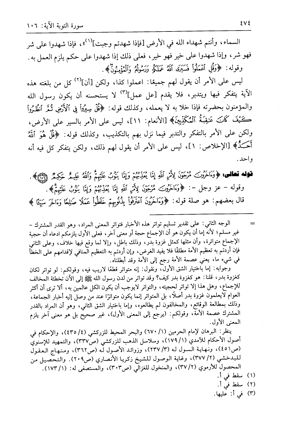وقوله: (وَقُلِ اعْمَلُوا فَسَيَرَى اللَّهُ عَمَلَكُمْ وَرَسُولُهُ وَالْمُؤْمِنُونَ).