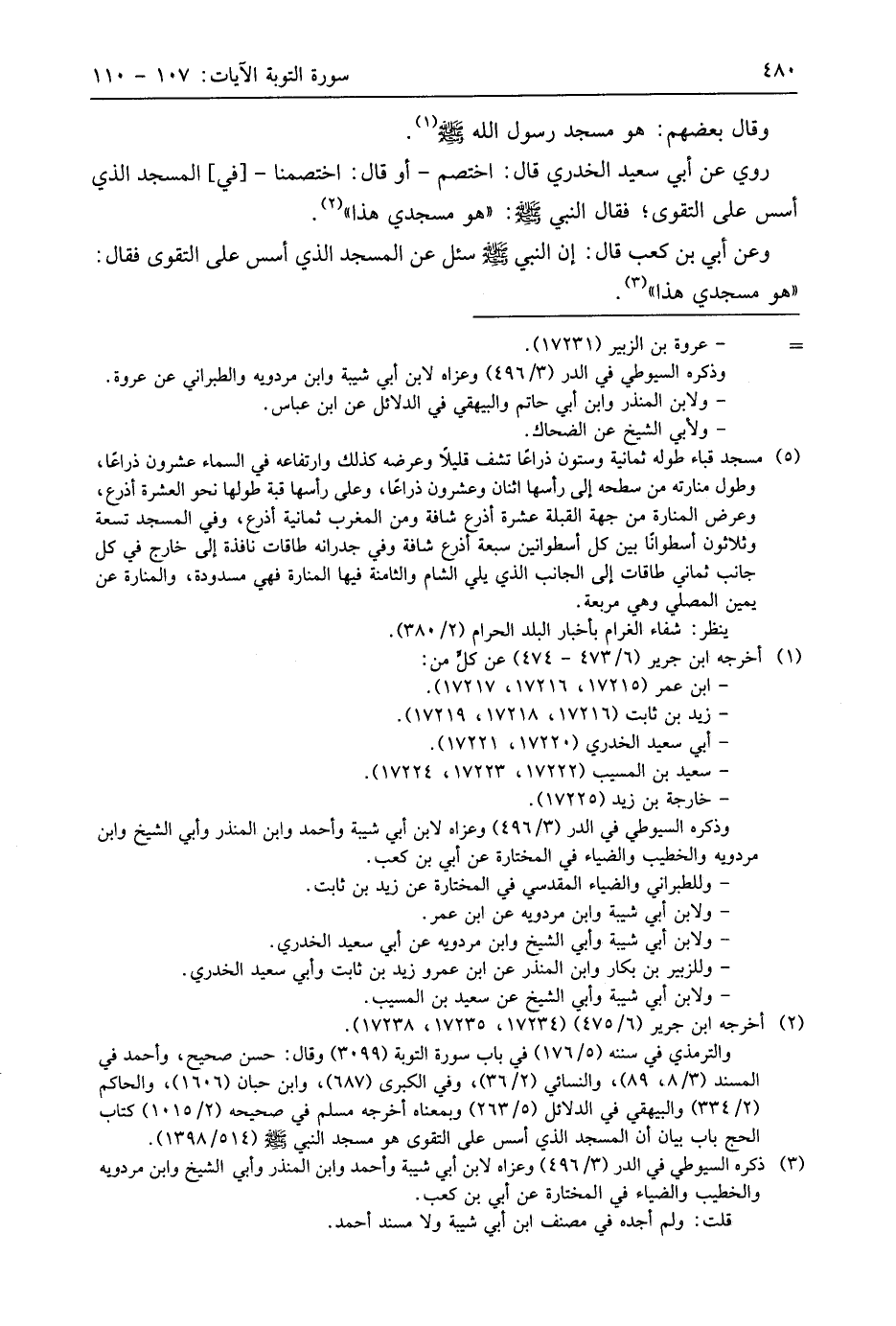 وعن أبي بن كعب قال: إن النبي - صَلَّى اللَّهُ عَلَيهِ وَسَلَّمَ - سئل عن المسجد الذي أسس على التقوى فقال: " هو مسجدي هذا ".
