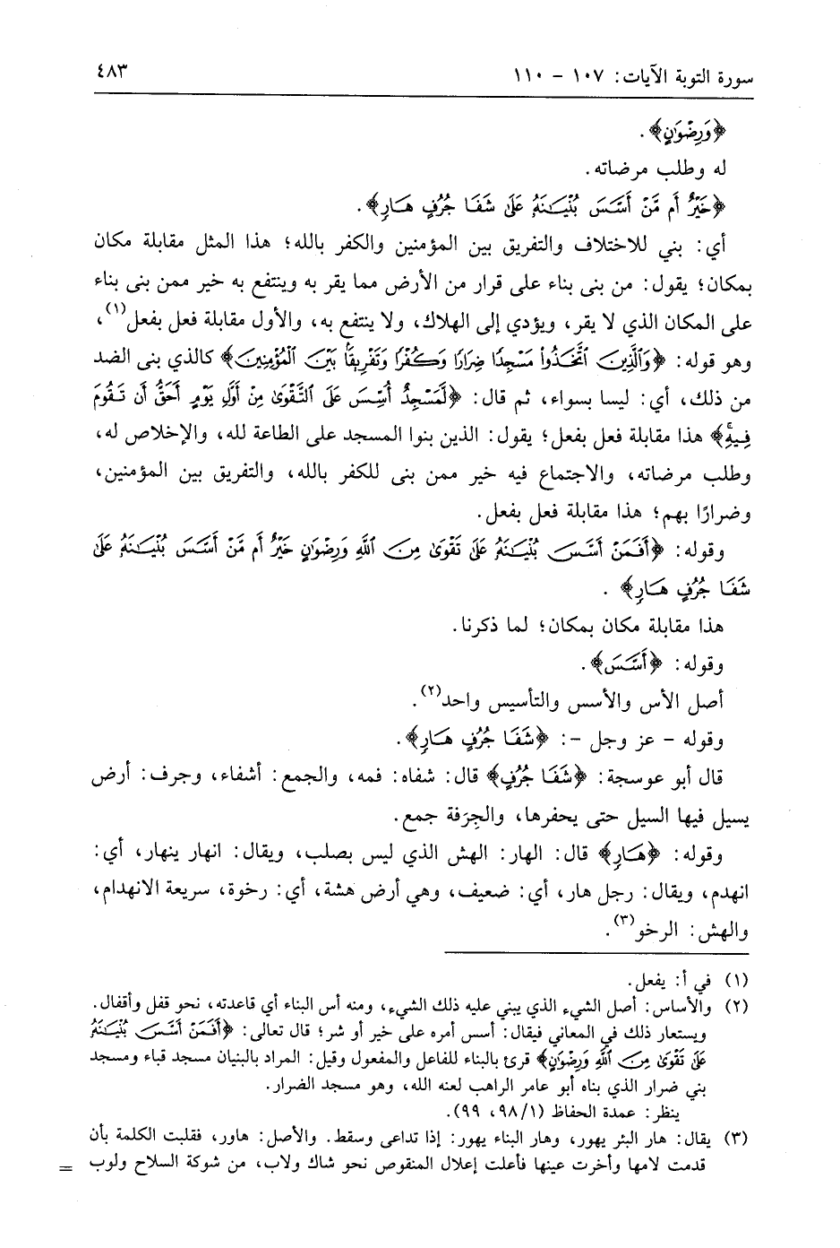 وقوله: (أَفَمَنْ أَسَّسَ بُنْيَانَهُ عَلَى تَقْوَى مِنَ اللَّهِ وَرِضْوَانٍ خَيْرٌ أَمْ مَنْ أَسَّسَ بُنْيَانَهُ عَلَى شَفَا جُرُفٍ هَارٍ).