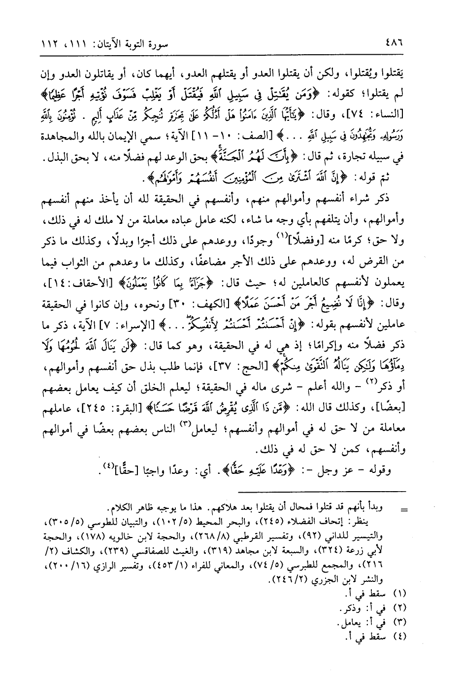 ذكر شراء أنفسهم وأموالهم منهم، وأنفسهم في الحقيقة لله أن يأخذ منهم أنفسهم وأموالهم، وأن يتلفهم بأي وجه ما شاء، لكنه عامل عباده معاملة من لا ملك له في ذلك، ولا حق؛ كرمًا منه أوفضلًا، وجودًا، ووعدهم على ذلك أجرًا وبدلًا، وكذلك ما ذكر من القرض له، ووعدهم على ذلك الأجر مضاعفًا، وكذلك ما وعدهم من الثواب فيما يعملون لأنفسهم كالعاملين له؛ حيث قال: (جَزَاءً بِمَا كَانُوا يَعْمَلُونَ)، وقال: (إِنَّا لَا نُضِيعُ أَجْرَ مَنْ أَحْسَنَ عَمَلًا)، ونحوه، وإن كانوا في الحقيقة عاملين لأنفسهم بقوله: (إِنْ أَحْسَنْتُمْ أَحْسَنْتُمْ لِأَنْفُسِكُمْ. . .) الآية، ذكر ما ذكر ففلا منه وإكرامًا؛ إذ هي له في الحقيقة، وهو كما قال: (لَنْ يَنَالَ اللَّهَ لُحُومُهَا وَلَا دِمَاؤُهَا وَلَكِنْ يَنَالُهُ التَّقْوَى مِنْكُمْ)، فإنما طلب بذل حق أنفسهم وأموالهم، أو ذكر - واللَّه أعلم - شرى ماله في الحقيقة؛ ليعلم الخلق أن كيف يعامل بعضهم بعضًا، وكذلك قال اللَّه: (مَنْ ذَا الَّذِي يُقْرِضُ اللَّهَ قَرْضًا حَسَنًا)، عاملهم معاملة من لا حق له في أموالهم وأنفسهم؛ ليعامل الناس بعضهم بعضًا في أموالهم وأنفسهم، كمن لا حق له في ذلك.