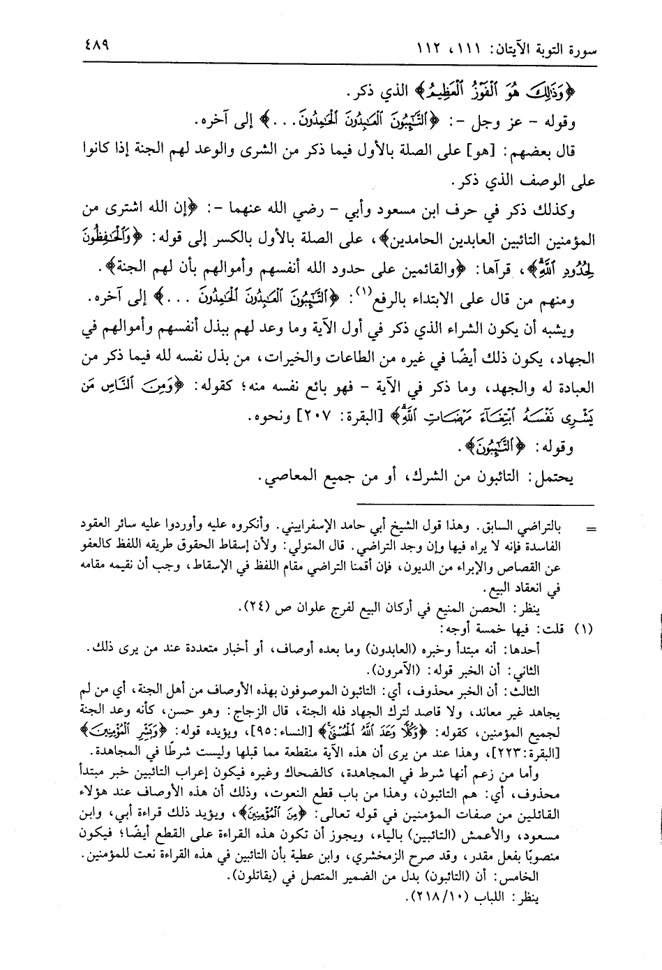 وقوله - عَزَّ وَجَلَّ -: (التَّائِبُونَ الْعَابِدُونَ الْحَامِدُونَ السَّائِحُونَ الرَّاكِعُونَ السَّاجِدُونَ الْآمِرُونَ بِالْمَعْرُوفِ وَالنَّاهُونَ عَنِ الْمُنْكَرِ وَالْحَافِظُونَ لِحُدُودِ اللَّهِ وَبَشِّرِ الْمُؤْمِنِينَ (112)