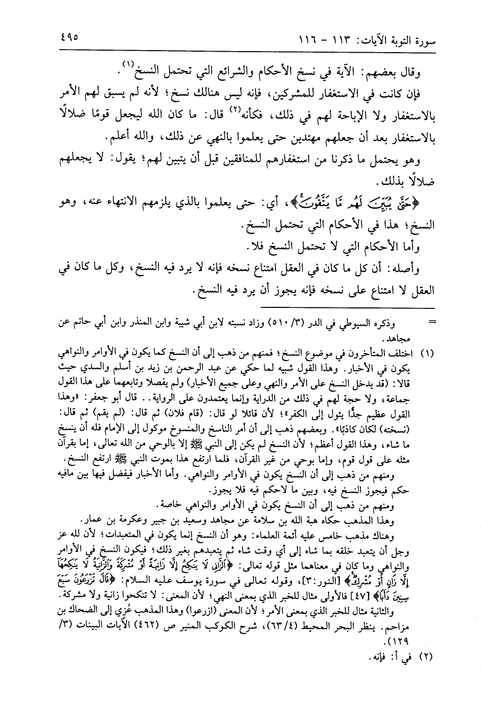 فإن كانت في الاستغفار للمشركين، فإنه ليس هنالك نسخ؛ لأنه لم يسبق لهم الأمر بالاستغفار ولا الإباحة لهم في ذلك، فكأنه قال: ما كان اللَّه ليجعل قومًا ضلالًا بالاستغفار بعد أن جعلهم مهتدين حتى يعلموا بالنهي عن ذلك، واللَّه أعلم.