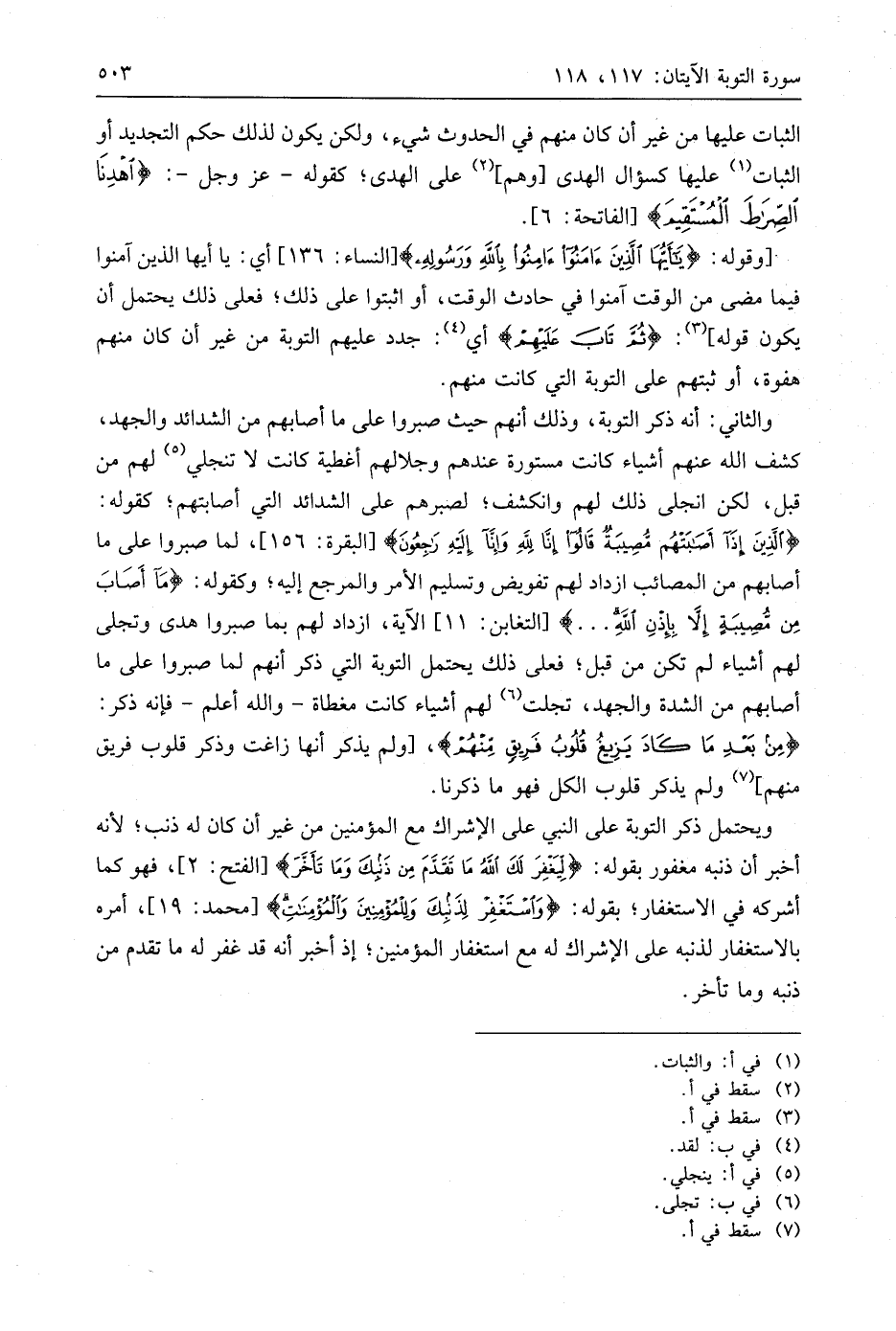 والثاني: أنه ذكر التوبة، وذلك أنهم حيث صبروا على ما أصابهم من الشدائد والجهد، كشف اللَّه عنهم أشياء كانت مستورة عندهم وجلالهم أغطية كانت لا تنجلي لهم من قبل، لكن انجلى ذلك لهم وانكشف؛ لصبرهم على الشدائد التي أصابتهم؛ كقوله: (الَّذِينَ إِذَا أَصَابَتْهُمْ مُصِيبَةٌ قَالُوا إِنَّا لِلَّهِ وَإِنَّا إِلَيْهِ رَاجِعُونَ)، لما صبروا على ما أصابهم من المصائب ازداد لهم تفويض وتسليم الأمر والمرجع إليه؛ وكقوله: (مَا أَصَابَ مِنْ مُصِيبَةٍ إِلَّا بِإِذْنِ اللَّهِ. . .) الآية، ازداد لهم بما صبروا هدى وتجلى لهم أشياء لم تكن من قبل؛ فعلى ذلك يحتمل التوبة التي ذكر أنهم لما صبروا على ما أصابهم من الشدة والجهد، تجلت لهم أشياء كانت مغطاة - واللَّه أعلم - فإنه ذكر: (مِنْ بَعْدِ مَا كَادَ يَزِيغُ قُلُوبُ فَرِيقٍ مِنْهُمْ)، ولم يذكر أنها زاغت وذكر قلوب فريق منهم، ولم يذكر قلوب الكل فهو ما ذكرنا.
