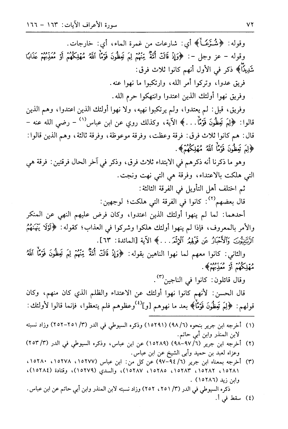 وفريق، قيل: لم يعتدوا، ولم يرتكبوا نهيه، ولا نهوا أُولَئِكَ الذين اعتدوا، وهم الذين قالوا: (لِمَ تَعِظُونَ قَوْمًا. . .) الآية، وكذلك روي عن ابن عَبَّاسٍ - رَضِيَ اللَّهُ عَنْهُ - قال: هم كانوا ثلاث فرق: فرقة وعظت، وفرقة موعوظة، وفرقة ثالثة، وهم الذين قالوا: (لِمَ تَعِظُونَ قَوْمًا اللَّهُ مُهْلِكُهُمْ).