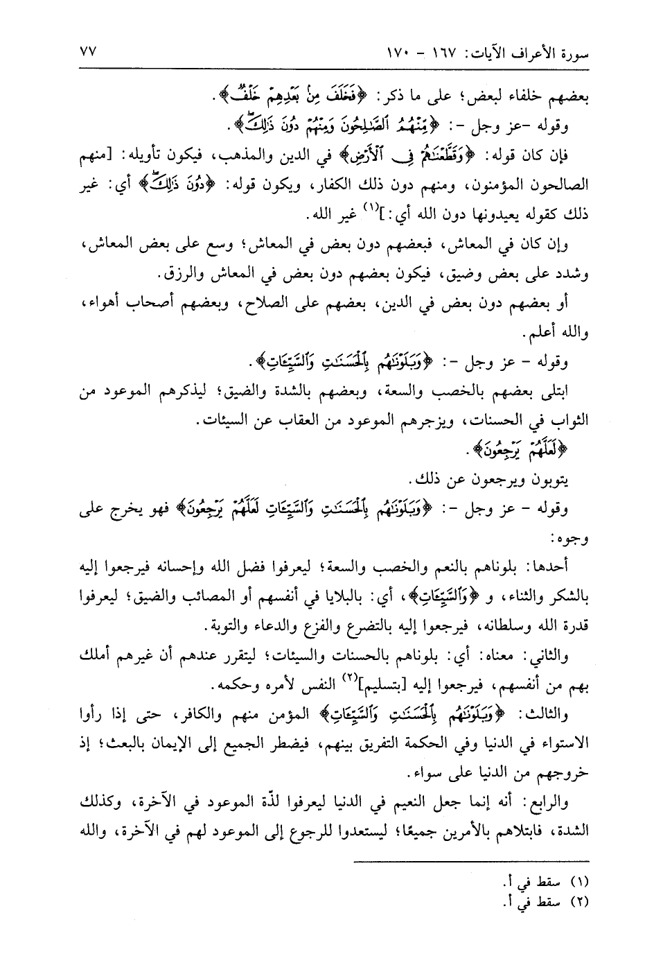 وقوله - عَزَّ وَجَلَّ -: (وَبَلَوْنَاهُمْ بِالْحَسَنَاتِ وَالسَّيِّئَاتِ).