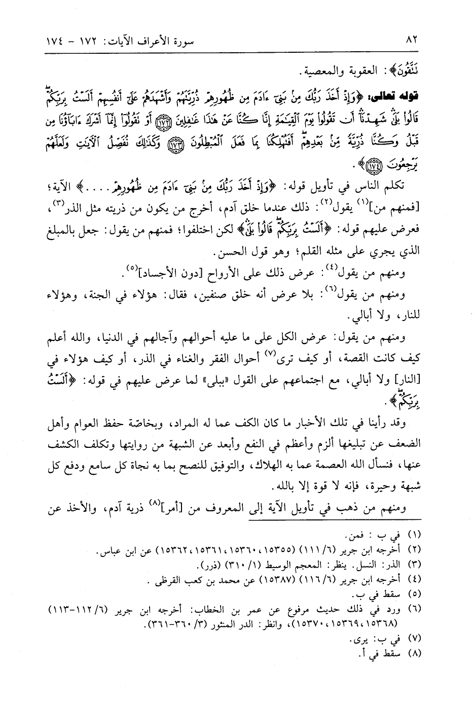 قوله تعالى: (وَإِذْ أَخَذَ رَبُّكَ مِنْ بَنِي آدَمَ مِنْ ظُهُورِهِمْ ذُرِّيَّتَهُمْ وَأَشْهَدَهُمْ عَلَى أَنْفُسِهِمْ أَلَسْتُ بِرَبِّكُمْ قَالُوا بَلَى شَهِدْنَا أَنْ تَقُولُوا يَوْمَ الْقِيَامَةِ إِنَّا كُنَّا عَنْ هَذَا غَافِلِينَ (172) أَوْ تَقُولُوا إِنَّمَا أَشْرَكَ آبَاؤُنَا مِنْ قَبْلُ وَكُنَّا ذُرِّيَّةً مِنْ بَعْدِهِمْ أَفَتُهْلِكُنَا بِمَا فَعَلَ الْمُبْطِلُونَ (173) وَكَذَلِكَ نُفَصِّلُ الْآيَاتِ وَلَعَلَّهُمْ يَرْجِعُونَ (174)