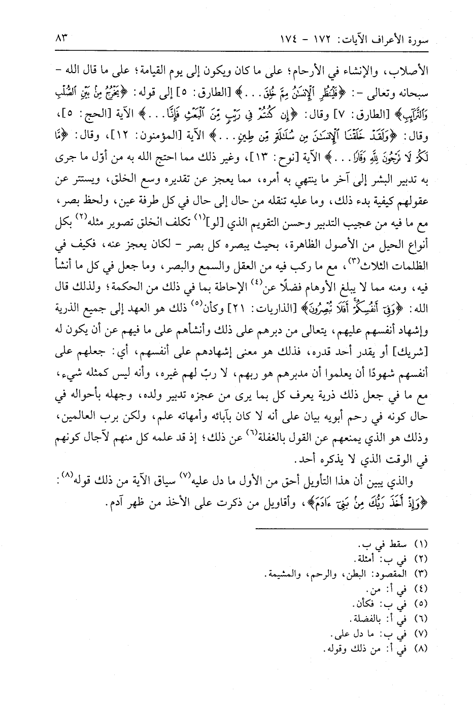 الأصلاب، والإنشاء في الأرحام؛ على ما كان ويكون إلى يوم القيامة؛ على ما قال اللَّه - سبحانه وتعالى -: (فَلْيَنْظُرِ الْإِنْسَانُ مِمَّ خُلِقَ. . .)، إلى قوله: (يَخْرُجُ مِنْ بَيْنِ الصُّلْبِ وَالتَّرَائِبِ)، وقال: (إِنْ كُنْتُمْ فِي رَيْبٍ مِنَ الْبَعْثِ فَإِنَّا. . .) الآية، وقال: (وَلَقَدْ خَلَقْنَا الْإِنْسَانَ مِنْ سُلَالَةٍ مِنْ طِينٍ. . .). وقال: (مَا لَكُمْ لَا تَرْجُونَ لِلَّهِ وَقَارً. . .)، وغير ذلك مما احتج اللَّه به من أول ما جرى به تدبير البشر إلى آخر ما ينتهي به أمره، مما يعجز عن تقديره وسع الخلق، ويستتر عن عقولهم كيفية بدء ذلك، وما عليه تنقله من حال إلى حال في كل طرفة عين، ولحظ بصر، مع ما فيه من عجيب التدبير وحسن التقويم الذي لو تكلف الخلق تصوير مثله بكل أنواع الحيل من الأصول الظاهرة، بحيث يبصره كل بصر - لكان يعجز عنه، فكيف في الظلمات الثلاث، مع ما ركب فيه من العقل والسمع والبصر، وما جعل في كل ما أنشأ فيه، ومنه مما لا يبلغ الأوهام فضلًا عن الإحاطة بما في ذلك من الحكمة؛ ولذلك قال اللَّه: (وَفِي أَنْفُسِكُمْ أَفَلَا تُبْصِرُونَ)، وكأن ذلك هو العهد إلى جميع الذرية وإشهاد أنفسهم عليهم، يتعالى من دبرهم على ذلك وأنشأهم على ما فيهم عن أن يكون له شريك، أو يقدر أحد قدره، فذلك هو معنى إشهادهم على أنفسهم، أي: جعلهم على أنفسهم شهودا أن يعلموا أن مدبرهم هو ربهم، لا ربّ لهم غيره، وأنه ليس كمثله شيء، مع ما في جعل ذلك ذرية يعرف كل بما يرى من عجزه تدبير ولده، وجهله بأحواله في حال كونه في رحم أبويه بيان على أنه لا كان بآبائه وأمهاته علم، ولكن برب العالمين، وذلك هو الذي يمنعهم عن القول بالغفلة عن ذلك؛ إذ قد علمه كل منهم لآجال كونهم في الوقت الذي لا يذكره أحد.
