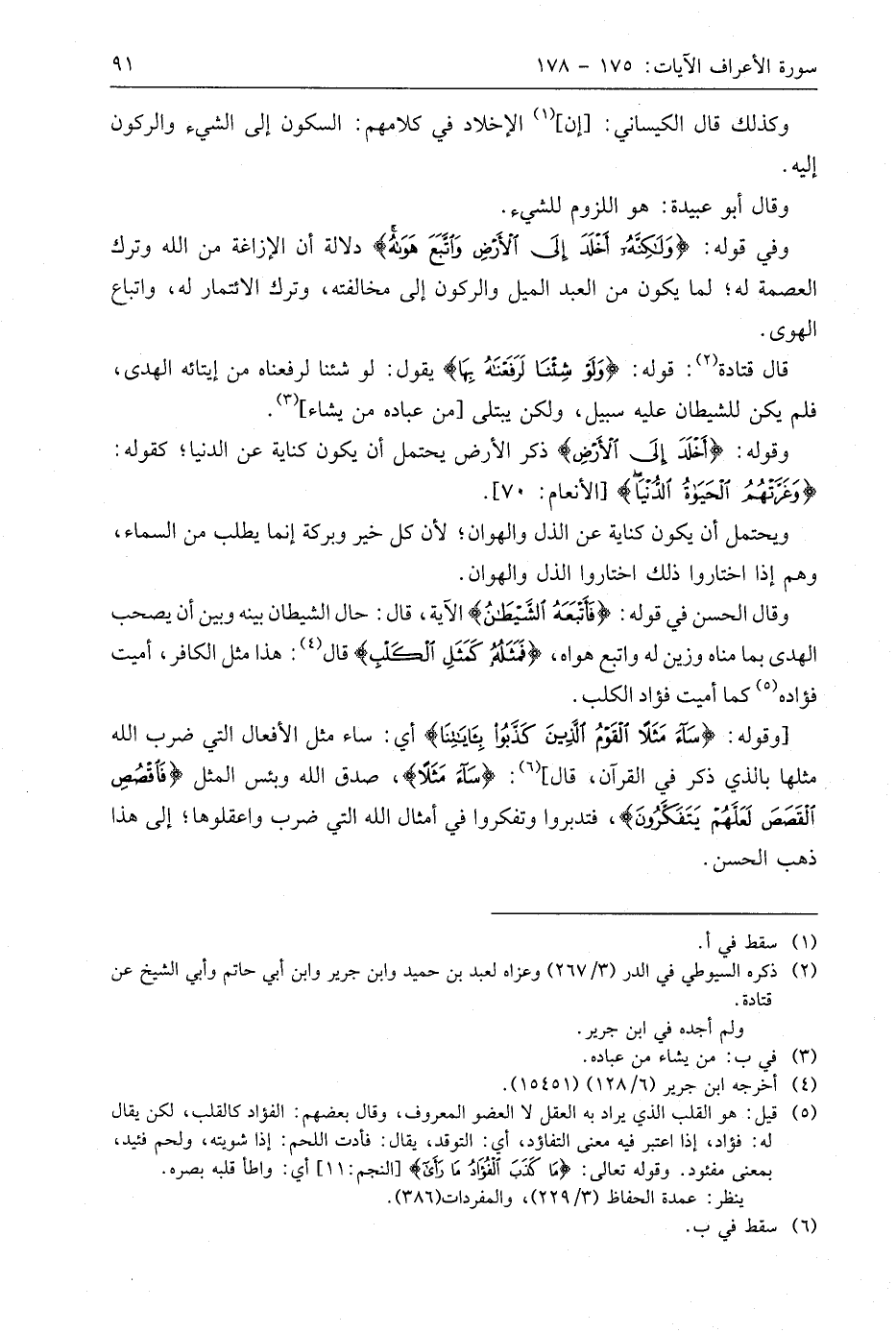 وقال الحسن في قوله: (فَأَتْبَعَهُ الشَّيْطَانُ) الآية، قال: حال الشيطان بينه وبين أن يصحب الهدى بما مناه وزين له واتبع هواه، (فَمَثَلُهُ كَمَثَلِ الْكَلْبِ) قال: هذا مثل الكافر، أميت فؤاده كما أميت فؤاد الكلب.