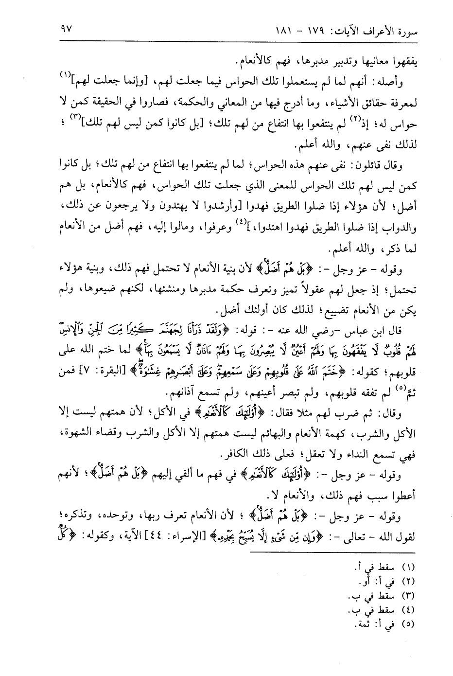 قال ابن عَبَّاسٍ - رَضِيَ اللَّهُ عَنْهُ -: قوله: (وَلَقَدْ ذَرَأْنَا لِجَهَنَّمَ كَثِيرًا مِنَ الْجِنِّ وَالْإِنْسِ لَهُمْ قُلُوبٌ لَا يَفْقَهُونَ بِهَا وَلَهُمْ أَعْيُنٌ لَا يُبْصِرُونَ بِهَا وَلَهُمْ آذَانٌ لَا يَسْمَعُونَ بِهَا) لما ختم اللَّه على قلوبهم؛ كقوله: (خَتَمَ اللَّهُ عَلَى قُلُوبِهِمْ وَعَلَى سَمْعِهِمْ وَعَلَى أَبْصَارِهِمْ غِشَاوَةٌ) فمن ثَمَّ لم تفقه قلوبهم، ولم تبصر أعينهم، ولم تسمع آذانهم.