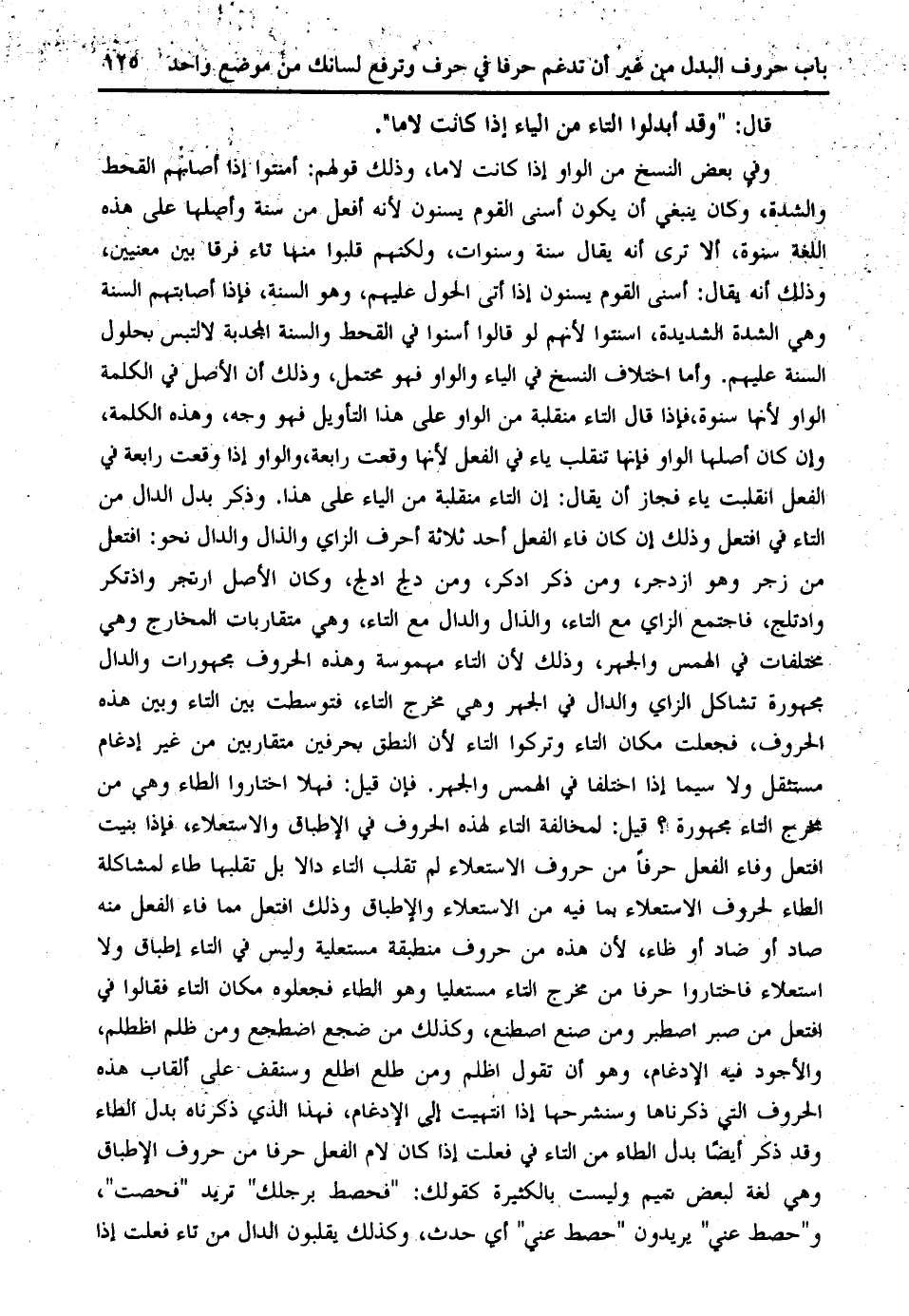 وأما اختلاف النسخ في الياء والواو فهو محتمل، وذلك أن الأصل في الكلمة الواو لأنها سنوة، فإذا قال التاء منقلبة من الواو على هذا التأويل فهو وجه، وهذه الكلمة وإن كان أصلها الواو فإنها تنقلب ياء في الفعل لأنها وقعت رابعة، والواو إذا وقعت رابعة في الفعل انقلبت ياء فجاز أن يقال: إن التاء منقلبة من الياء على هذا. وذكر بدل الدال من التاء في افتعل وذلك إن كان فاء الفعل أحد ثلاثة أحرف الزاي والذال والدال نحو: افتعل من زجر وهو ازدجر، ومن ذكر ادكر، ومن دلج ادلج، وكان الأصل ارتجر واذتكر وادتلج، فاجتمع الزاي مع التاء، والذال والدال مع التاء، وهي متقاربات المخارج وهي مختلفات في الهمس والجهر، وذلك لأن التاء مهموسة وهذه الحروف مجهورات والدال مجهورة تشاكل الزاي والدال في الجهر وهي مخرج التاء، فتوسطت بين التاء وبين هذه الحروف، فجعلت مكان التاء وتركوا التاء لأن النطق بحرفين متقاربين من غير إدغام مستثقل ولا سيما إذا اختلفا في الهمس والجهر. فإن قيل: فهلا اختاروا الطاء وهي من مخرج التاء مجهورة؟ قيل: لمخالفة التاء لهذه الحروف في الإطباق والاستعلاء، فإذا بنيت افتعل وفاء الفعل حرفا من حروف الاستعلاء لم تقلب التاء دالا بل تقلبها طاء لمشاكلة الطاء لحروف الاستعلاء بما فيه من الاستعلاء والإطباق وذلك افتعل مما فاء الفعل منه صاد أو ضاد أو ظاء، لأن هذه من حروف منطبقة مستعلية وليس في التاء إطباق ولا استعلاء فاختاروا حرفا من مخرج التاء مستعليا وهو الطاء فجعلوه مكان التاء فقالوا في افتعل من صبر اصطبر ومن صنع اصطنع، وكذلك من ضجع اضطجع ومن ظلم اظطلم، والأجود فيه الإدغام، وهو أن تقول اظلم ومن طلع اطلع وسنقف على ألقاب هذه الحروف التي ذكرناها وسنشرحها إذا انتهيت إلى الإدغام، فهذا الذي ذكرناه بدل الطاء وقد ذكر أيضا بدل الطاء من التاء في فعلت إذا كان لام الفعل حرفا من حروف الإطباق وهي لغة لبعض تميم وليست بالكثيرة كقولك: " فحصط برجلك " تريد " فحصت "، و " حصط عني " يريدون " حصط عني " أي حدث، وكذلك يقلبون الدال من تاء فعلت إذا