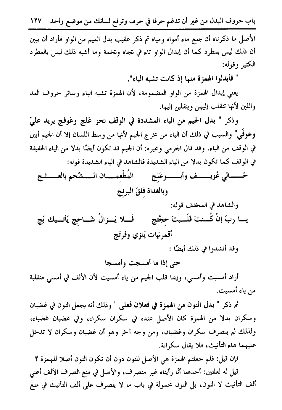 وذكر " بدل الجيم من الياء المشددة في الوقف نحو علج وعوفج يريد عليّ وعوفّي " والسبب في ذلك أن الياء من مخرج الجيم لأنها من وسط اللسان إلا أن الجيم أبين في الوقف من الياء. وقد قال الجرمي وغيره: أن الجيم قد تكون أيضا بدلا من الياء الخفيفة في الوقف كما تكون بدلا من الياء الشديدة فالشاهد في الياء الشديدة قوله: