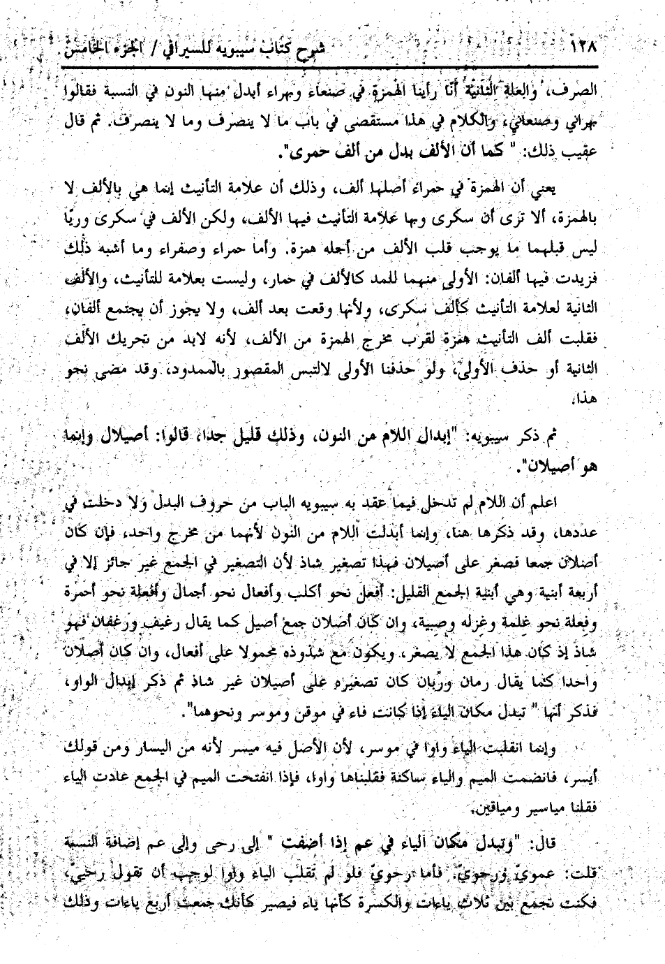 الصرف، والعلة الثانية أنّا رأينا الهمزة في صنعاء وبهراء أبدل منها النون في النسبة فقالوا بهراني وصنعاني، والكلام في هذا مستقصى في باب ما لا ينصرف وما لا ينصرف. ثم قال عقيب ذلك: " كما أن الألف بدل من ألف حمرى ".
