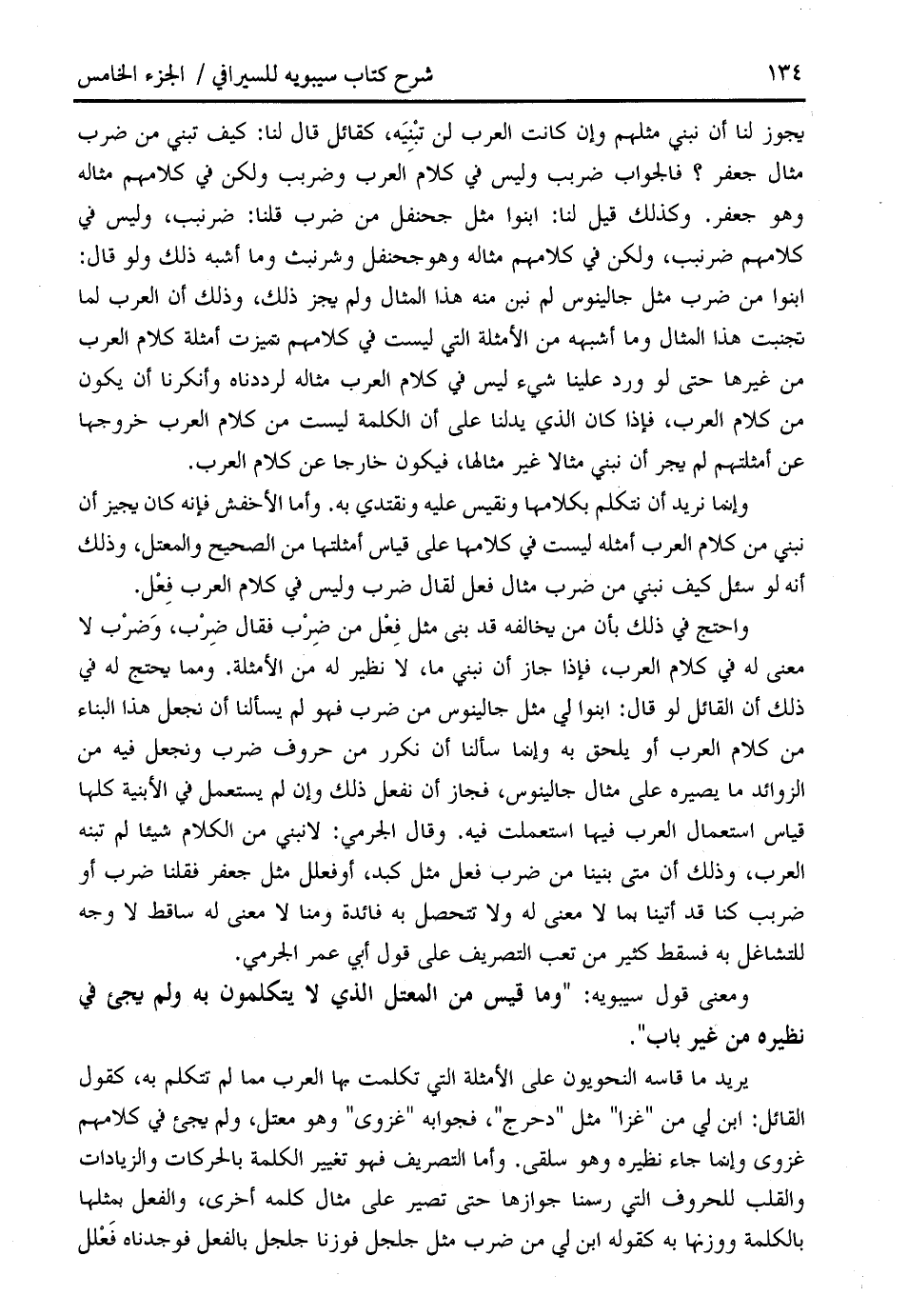 واحتج في ذلك بأن من يخالفه قد بنى مثل فعل من ضرب فقال ضرب، وضرب لا معنى له في كلام العرب، فإذا جاز أن نبني ما، لا نظير له من الأمثلة. ومما يحتج له في ذلك أن القائل لو قال: ابنوا لي مثل جالينوس من ضرب فهو لم يسألنا أن نجعل هذا البناء من كلام العرب أو يلحق به وإنما سألنا أن نكرر من حروف ضرب ونجعل فيه من الزوائد ما يصيره على مثال جالينوس، فجاز أن نفعل ذلك وإن لم يستعمل في الأبنية كلها قياس استعمال العرب فيها استعملت فيه. وقال الجرمي: لا نبني من الكلام شيئا لم تبنه العرب، وذلك أن متى بنينا من ضرب فعل مثل كبد، أو فعلل مثل جعفر فقلنا ضرب أو ضربب كنا قد أتينا بما لا معنى له ولا تتحصل به فائدة ومنا لا معنى له ساقط لا وجه للتشاغل به فسقط كثير من تعب التصريف على قول أبي عمر الجرمي.