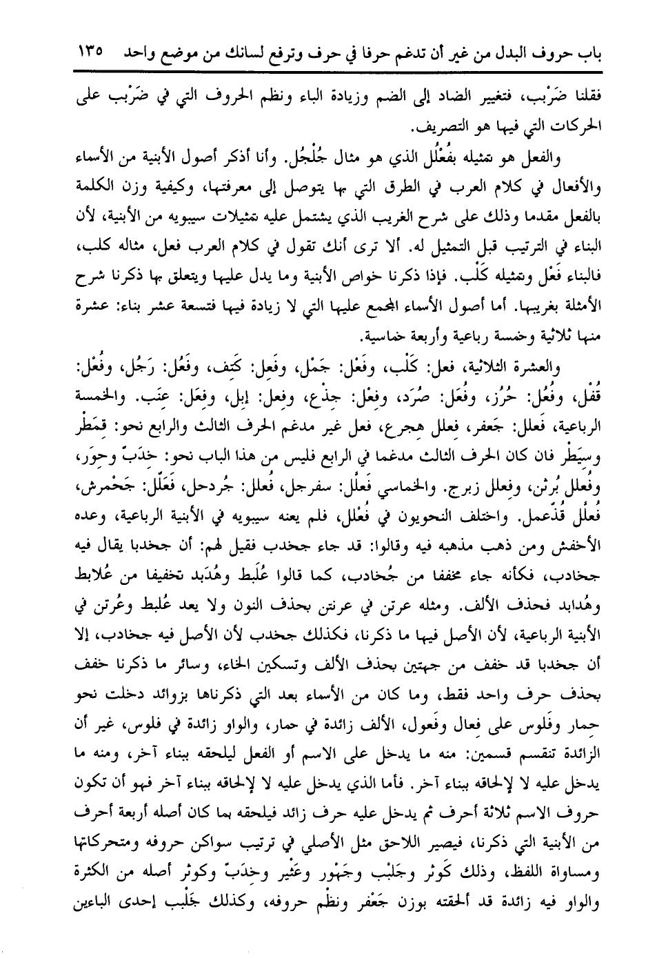 فقلنا ضربب، فتغيير الضاد إلى الضم وزيادة الباء ونظم الحروف التي في ضربب على الحركات التي فيها هو التصريف.