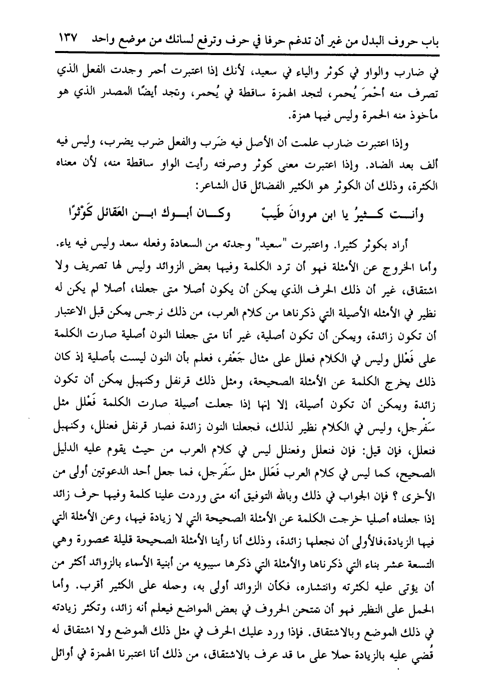 وإذا اعتبرت ضارب علمت أن الأصل فيه ضرب والفعل ضرب يضرب، وليس فيه ألف بعد الضاد. وإذا اعتبرت معنى كوثر وصرفته رأيت الواو ساقطة منه، لأن معناه الكثرة، وذلك أن الكوثر هو الكثير الفضائل قال الشاعر: