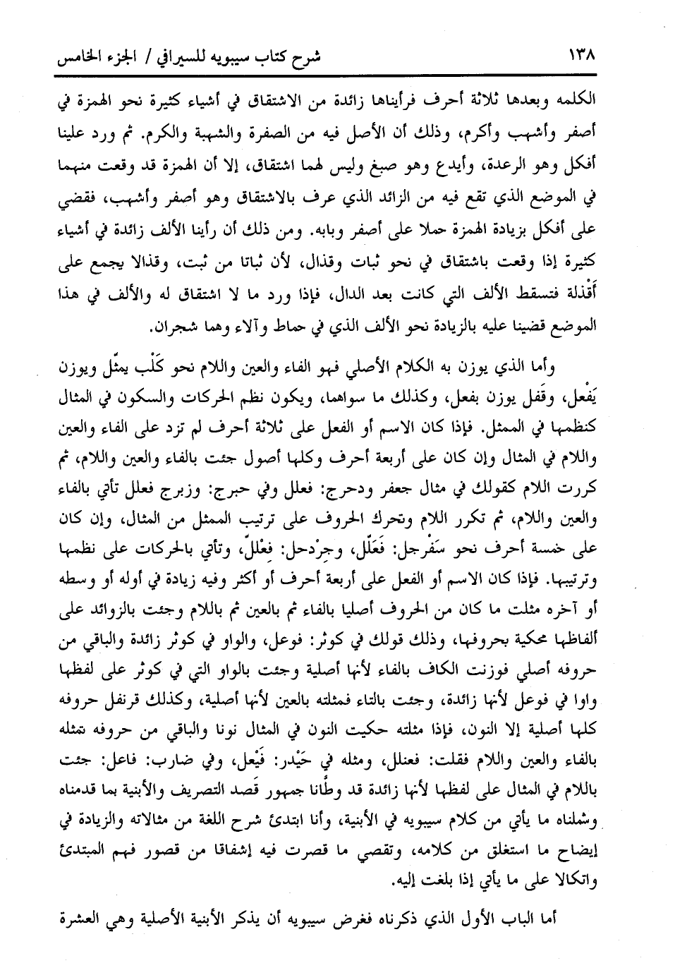 وأما الذي يوزن به الكلام الأصلي فهو الفاء والعين واللام نحو كلب يمثّل ويوزن يفعل، وقفل يوزن بفعل، وكذلك ما سواهما، ويكون نظم الحركات والسكون في المثال كنظمها في الممثل. فإذا كان الاسم أو الفعل على ثلاثة أحرف لم تزد على الفاء والعين واللام في المثال وإن كان على أربعة أحرف وكلها أصول جئت بالفاء والعين واللام، ثم كررت اللام كقولك في مثال جعفر ودحرج: فعلل وفي حبرج: وزبرج فعلل تأتي بالفاء والعين واللام، ثم تكرر اللام وتحرك الحروف على ترتيب الممثل من المثال، وإن كان على خمسة أحرف نحو سفرجل: فعلّل، وجردحل: فعللّ، وتأتي بالحركات على نظمها وترتيبها. فإذا كان الاسم أو الفعل على أربعة أحرف أو أكثر وفيه زيادة في أوله أو وسطه أو آخره مثلت ما كان من الحروف أصليا بالفاء ثم بالعين ثم باللام وجئت بالزوائد على ألفاظها محكية بحروفها، وذلك قولك في كوثر: فوعل، والواو في كوثر زائدة والباقي من حروفه أصلي فوزنت الكاف بالفاء لأنها أصلية وجئت بالواو التي في كوثر على لفظها واوا في فوعل لأنها زائدة، وجئت بالتاء فمثلته بالعين لأنها أصلية، وكذلك قرنفل حروفه كلها أصلية إلا النون، فإذا مثلته حكيت النون في المثال نونا والباقي من حروفه تمثله بالفاء والعين واللام فقلت: فعنلل، ومثله في حيدر: فيعل، وفي ضارب: فاعل: جئت باللام في المثال على لفظها لأنها زائدة قد وطّانا جمهور قصد التصريف والأبنية بما قدمناه وشملناه ما يأتي من كلام سيبويه في الأبنية، وأنا ابتدئ شرح اللغة من مثالاته والزيادة في إيضاح ما استغلق من كلامه، وتقصي ما قصرت فيه إشفاقا من قصور فهم المبتدئ واتكالا على ما يأتي إذا بلغت إليه.