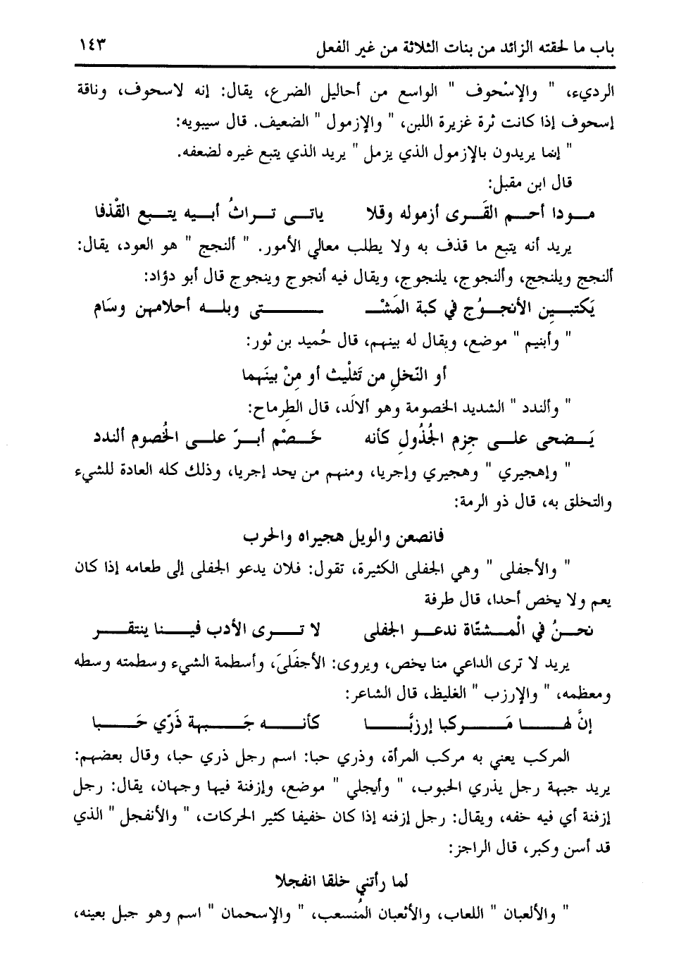 الرديء، " والإسحوف " الواسع من أحاليل الضرع، يقال: إنه لاسحوف، وناقة إسحوف إذا كانت ثرة غزيرة اللبن، " والإزمول " الضعيف. قال سيبويه: