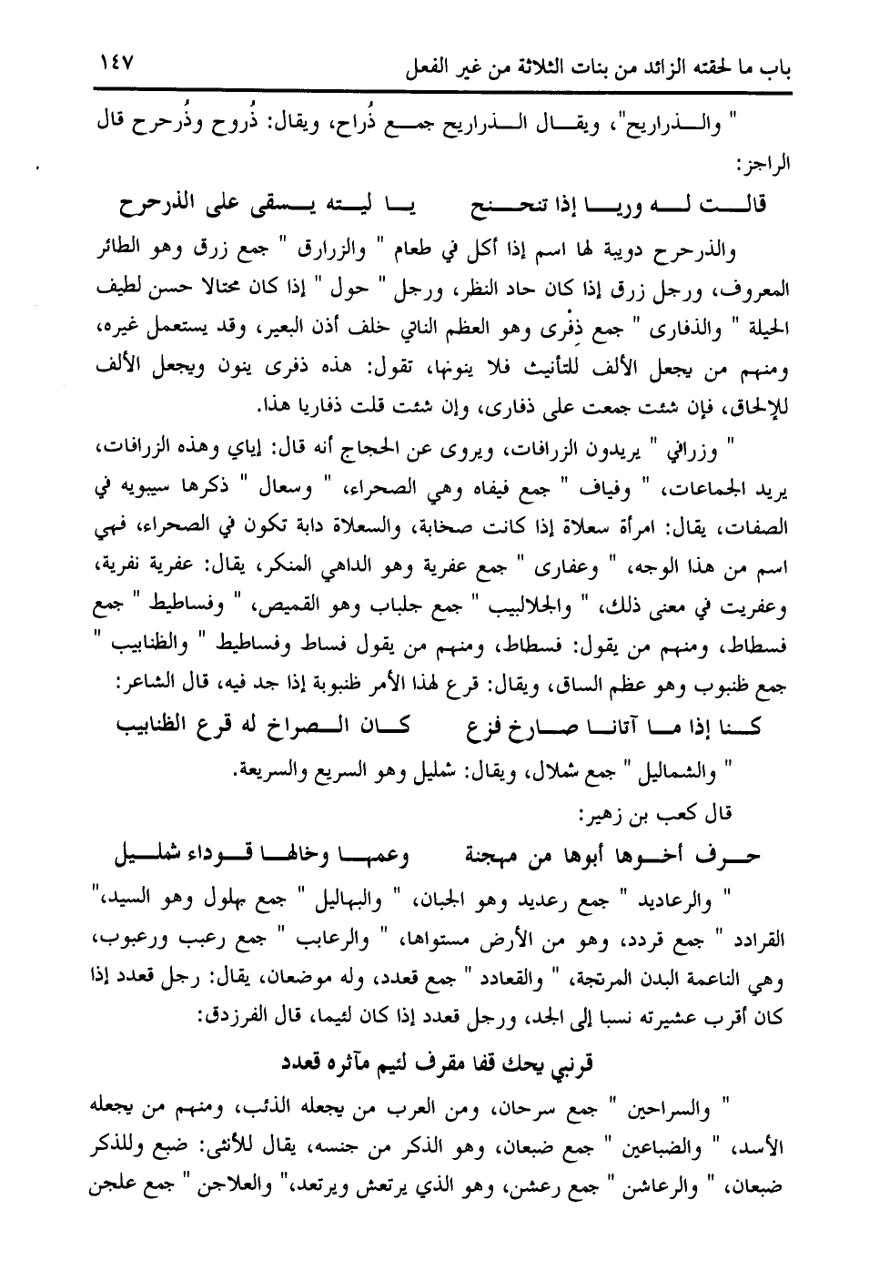 والذرحرح دويبة لها اسم إذا أكل في طعام " والزرارق " جمع زرق وهو الطائر المعروف، ورجل زرق إذا كان حاد النظر، ورجل " حول " إذا كان محتالا حسن لطيف الحيلة " والذفارى " جمع ذفرى وهو العظم الناتي خلف أذن البعير، وقد يستعمل غيره، ومنهم من يجعل الألف للتأنيث فلا ينونها، تقول: هذه ذفرى ينون ويجعل الألف للإلحاق، فإن شئت جمعت على ذفارى، وإن شئت قلت ذفاريا هذا.