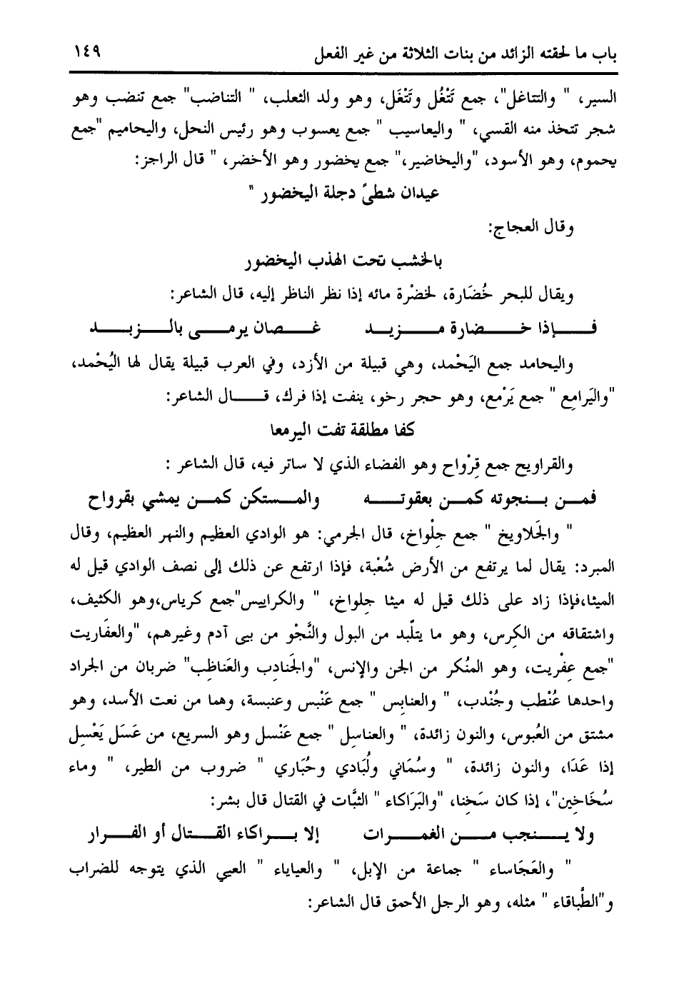 السير، " والتتاغل "، جمع تتغل وتتغل، وهو ولد الثعلب، " التناضب " جمع تنضب وهو شجر تتخذ منه القسي، " واليعاسيب " جمع يعسوب وهو رئيس النحل، واليحاميم " جمع يحموم، وهو الأسود، " واليخاضير، " جمع يخضور وهو الأخضر، " قال الراجز: