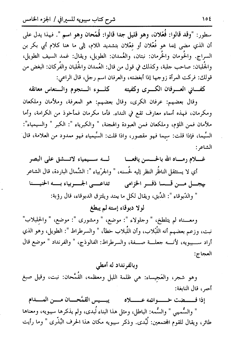 سطور: " وقد قالوا: فعّلان، وهو قليل جدا قالوا: قمّحان وهو اسم ". فهذا يدل على أن الذي مضى إنما هو فعّلان أو فعّلان بتشديد اللام، إلى ما هنا كلام أبي بكر بن السراج. والحومان والخرمان: نبتان، والغمدان: الطويل، ويقال: غمد السيف الطويل، والجلبان: صاحب جلبة، وكذلك في قول من قال: العمدان والجلبان والفركان: البغض من قولك: فركت المرأة زوجها إذا أبغضته، والعرفان اسم رجل، قال الراعي:
