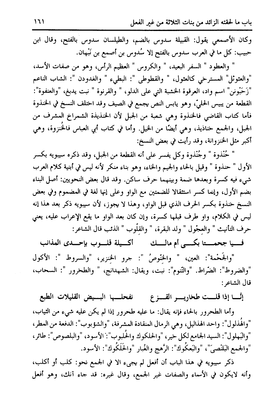 " حنذوة " وجنذوة وكل يفسر على أنه القطعة من الجبل، وقد ذكره سيبويه بكسر الأول " حنذوة " وقيل بالحاء والجيم والخاء، وهو بناء منكر لأنه ليس في أبنية كلام العرب شيء فيه كسرة وبعدها ضمة وبينهما حرف ساكن. وقد قال بعض النحويين: أصل البناء بضم الأول، وإنما كسر استثقالا للضمتين مع الواو وعلى إنها لغة في المضموم وفي بعض النسخ خنذوة بكسر الحرف الذي قبل الواو، وهذا لا يجوز، لأن سيبويه ذكر بعد هذا إنه ليس في الكلام، واو طرف قبلها كسرة، وإن كان بعد الواو ما يقع الإعراب عليه، يعني حرف التأنيث " والعجّول " ولد البقرة، " والقلّوب " الذئب قال الشاعر: