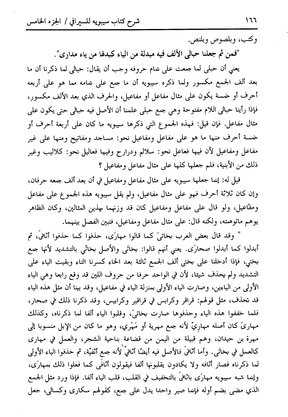 " وقد قال بعض العرب بخاتى كما قالوا مهارى، حذفوا كما حذفوا أثافى، ثم أبدلوا كما أبدلوا صحارى. يعني أنهم قالوا: بخاتى والأصل بخاتّي بالتشديد لأنها جمع بختي، فإذا أدخلنا على بختى ألف الجمع ثالثة بعد الخاء كسرنا التاء وبقيت الياء على التشديد ولم يحذف شيئا، لأن في الواحد حرفا من حروف اللين قد وقع رابعا وهي الياء الأولى من الياءين، وصارت الياء الأولى بمنزلة الياء في مفاعيل، وقد بينا أن مثل هذه الياء قد تحذف، مثل قولهم: قراقر وكرابس في قراقير وكرابيس، وقد ذكرنا ذلك في صحار، فلما خففوا هذه الياء وحذفوها صارت بخاتى، وقلبوا الياء ألفا لما ذكرناه، وكذلك مهارى كان أصله مهاريّ لأنه جمع مهرية أو مهري، وهو ما كان من الإبل منسوبا إلى مهرة بن حيدان، وهم قبيلة من اليمن من قضاعة بناحية الشجر، والعمل في مهارى كالعمل في بخاتي. وأما أثافى فالأصل فيه أيضا أثافيّ لأنه جمع أثفيّة، ثم حذفوا الياء الأولى لما ذكرناه فصار أثافه ولا يكادون يقلبونها ألفا فيقولون أثافى كما فعلوا ذلك بمهارى، وإنما شبه سيبويه مهارى باثافى بالتخفيف في القلب، قلب الياء ألفا. فإذا ورد مثل الجمع الذي مضى بضم أوله فإنما صير واحدا يدل على جمع، كقولهم سكارى وكسالى، جعل