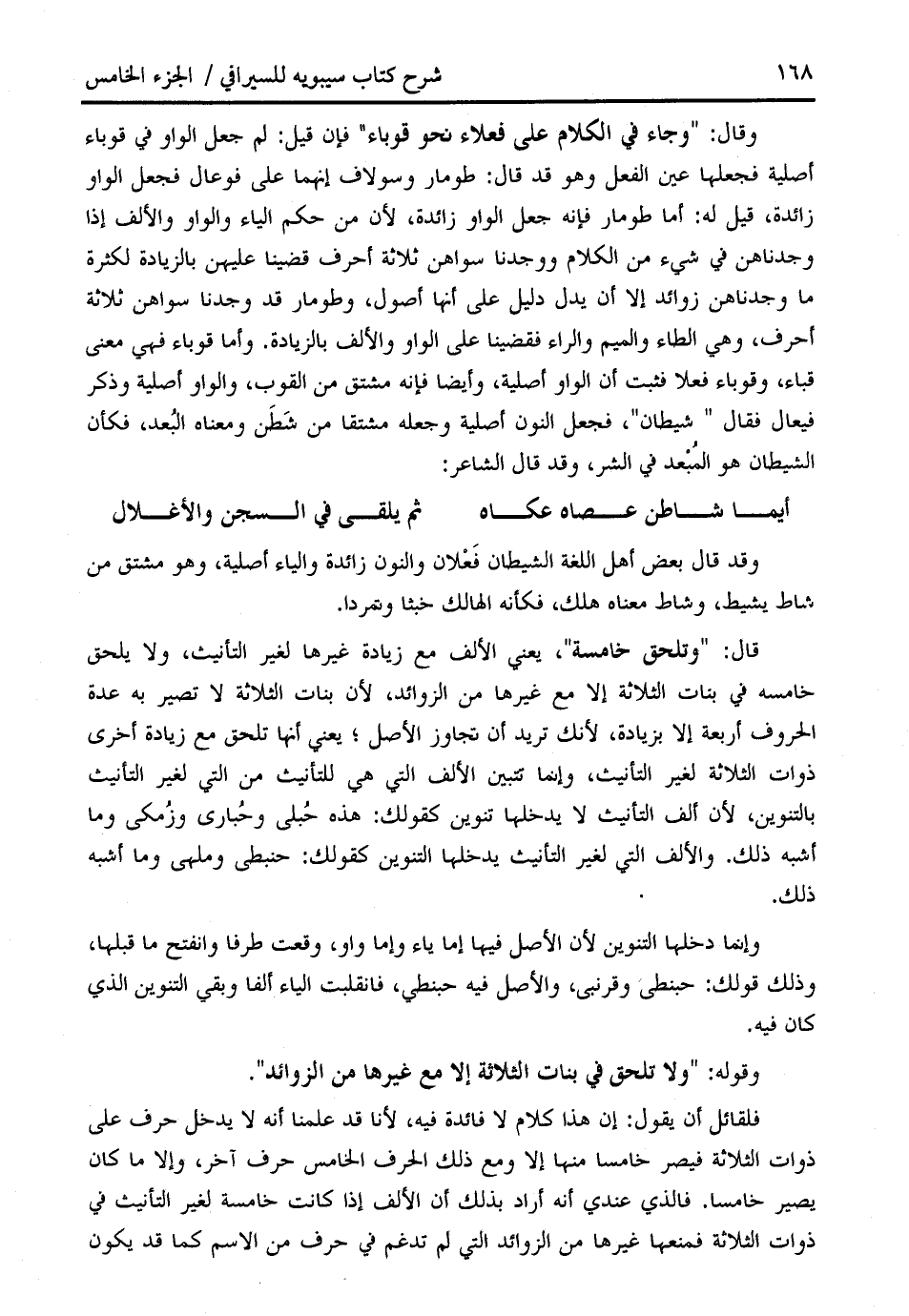 وقال: " وجاء في الكلام على فعلاء نحو قوباء " فإن قيل: لم جعل الواو في قوباء أصلية فجعلها عين الفعل وهو قد قال: طومار وسولاف إنهما على فوعال فجعل الواو زائدة، قيل له: أما طومار فإنه جعل الواو زائدة، لأن من حكم الياء والواو والألف إذا وجدناهن في شيء من الكلام ووجدنا سواهن ثلاثة أحرف قضينا عليهن بالزيادة لكثرة ما وجدناهن زوائد إلا أن يدل دليل على أنها أصول، وطومار قد وجدنا سواهن ثلاثة أحرف، وهي الطاء والميم والراء فقضينا على الواو والألف بالزيادة. وأما قوباء فهي معنى قباء، وقوباء فعلا فثبت أن الواو أصلية، وأيضا فإنه مشتق من القوب، والواو أصلية وذكر فيعال فقال " شيطان "، فجعل النون أصلية وجعله مشتقا من شطن ومعناه البعد، فكأن الشيطان هو المبعد في الشر، وقد قال الشاعر: