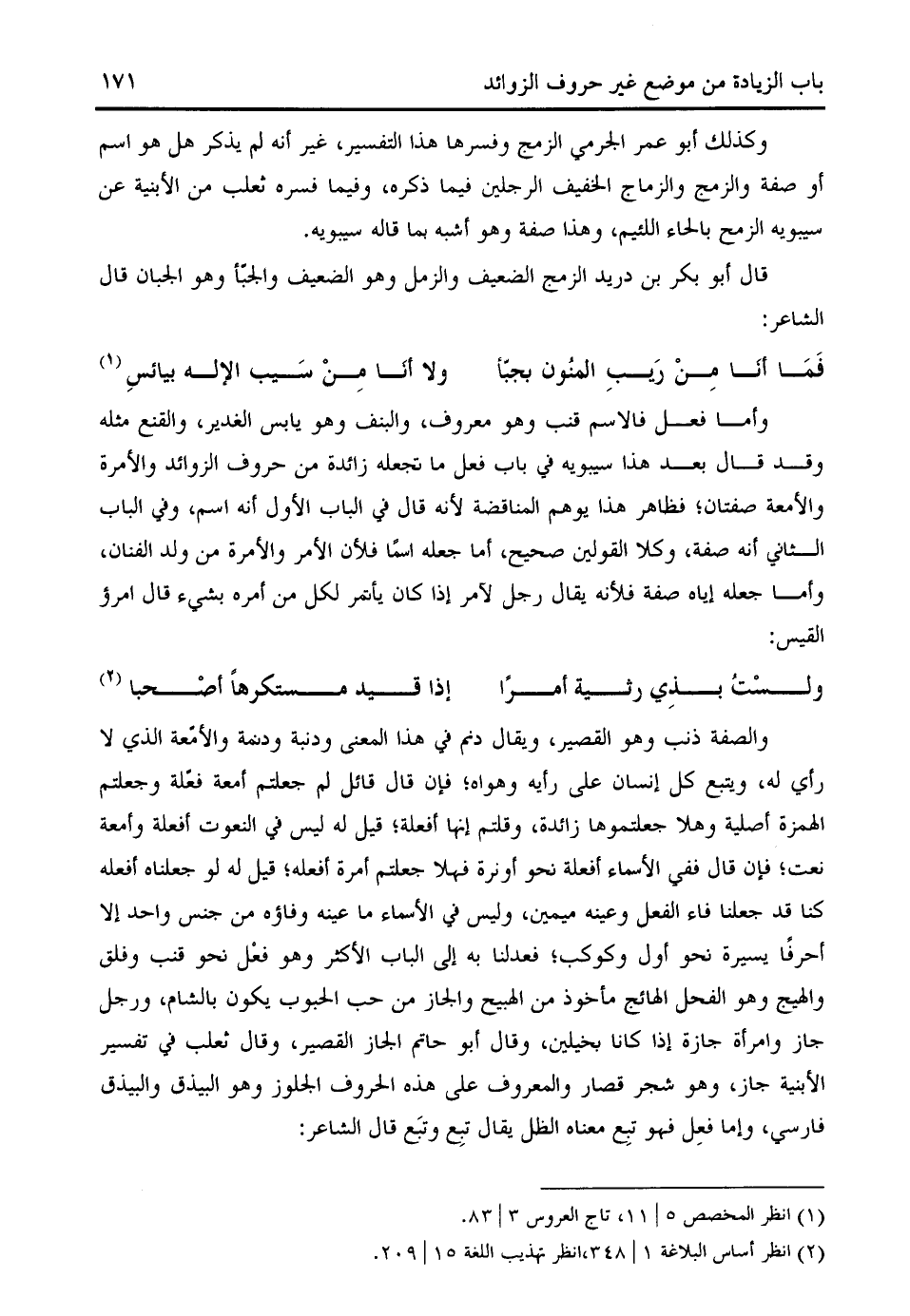 والصفة ذنب وهو القصير، ويقال دنم في هذا المعنى ودنبة ودنمة والأمّعة الذي لا رأي له، ويتبع كل إنسان على رأيه وهواه؛ فإن قال قائل لم جعلتم أمعة فعّلة وجعلتم الهمزة أصلية وهلا جعلتموها زائدة، وقلتم إنها أفعلة؛ قيل له ليس في النعوت أفعلة وأمعة نعت؛ فإن قال ففي الأسماء أفعلة نحو أونرة فهلا جعلتم أمرة أفعله؛ قيل له لو جعلناه أفعله كنا قد جعلنا فاء الفعل وعينه ميمين، وليس في الأسماء ما عينه وفاؤه من جنس واحد إلا أحرفا يسيرة نحو أول وكوكب؛ فعدلنا به إلى الباب الأكثر وهو فعل نحو قنب وفلق والهيج وهو الفحل الهائج مأخوذ من الهبيح والجاز من حب الحبوب يكون بالشام، ورجل جاز وامرأة جازة إذا كانا بخيلين، وقال أبو حاتم الجاز القصير، وقال ثعلب في تفسير الأبنية جاز، وهو شجر قصار والمعروف على هذه الحروف الجلوز وهو البيذق والبيذق فارسي، وإما فعل فهو تبع معناه الظل يقال تبع وتبع قال الشاعر: