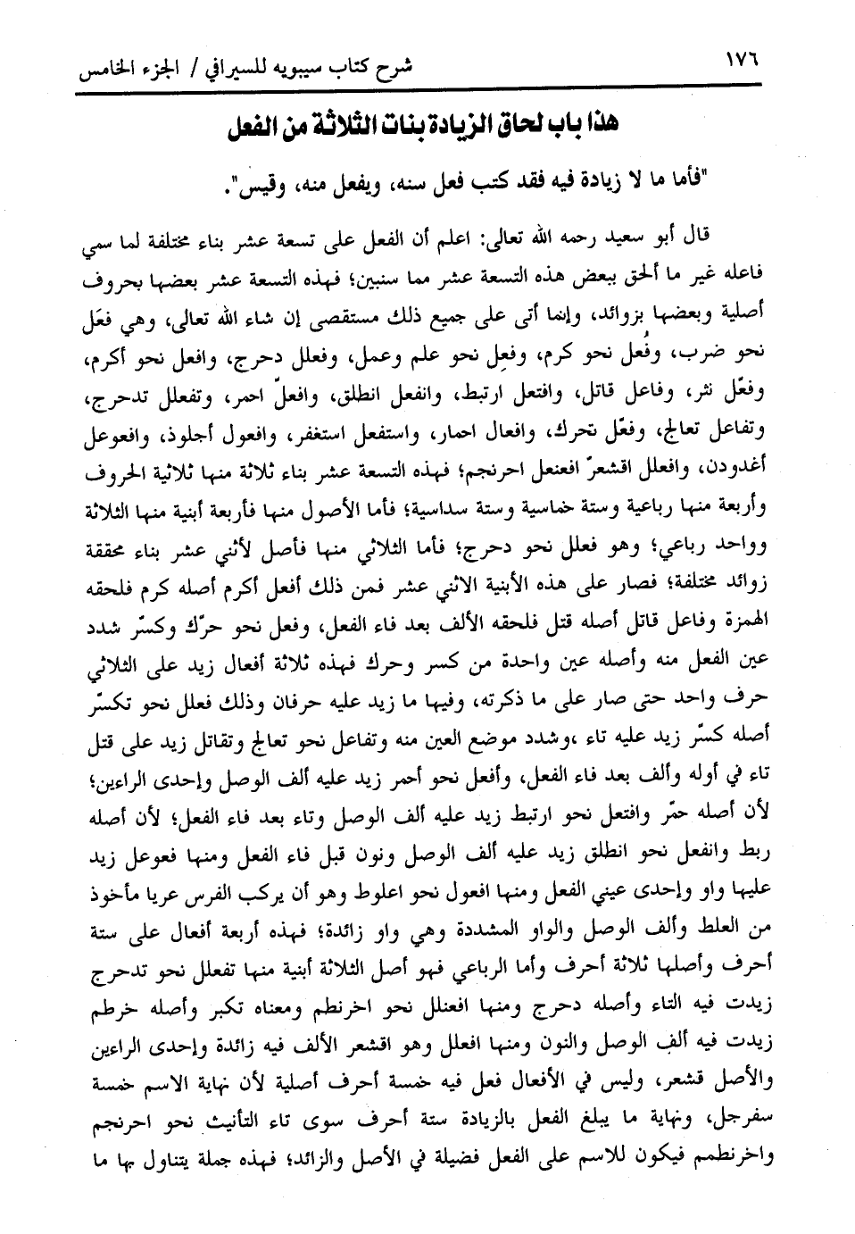 قال أبو سعيد رحمه الله تعالى: اعلم أن الفعل على تسعة عشر بناء مختلفة لما سمي فاعله غير ما ألحق ببعض هذه التسعة عشر مما سنبين؛ فهذه التسعة عشر بعضها بحروف أصلية وبعضها بزوائد، وإنما أتى على جميع ذلك مستقصى إن شاء الله تعالى، وهي فعل نحو ضرب، وفعل نحو كرم، وفعل نحو علم وعمل، وفعلل دحرج، وافعل