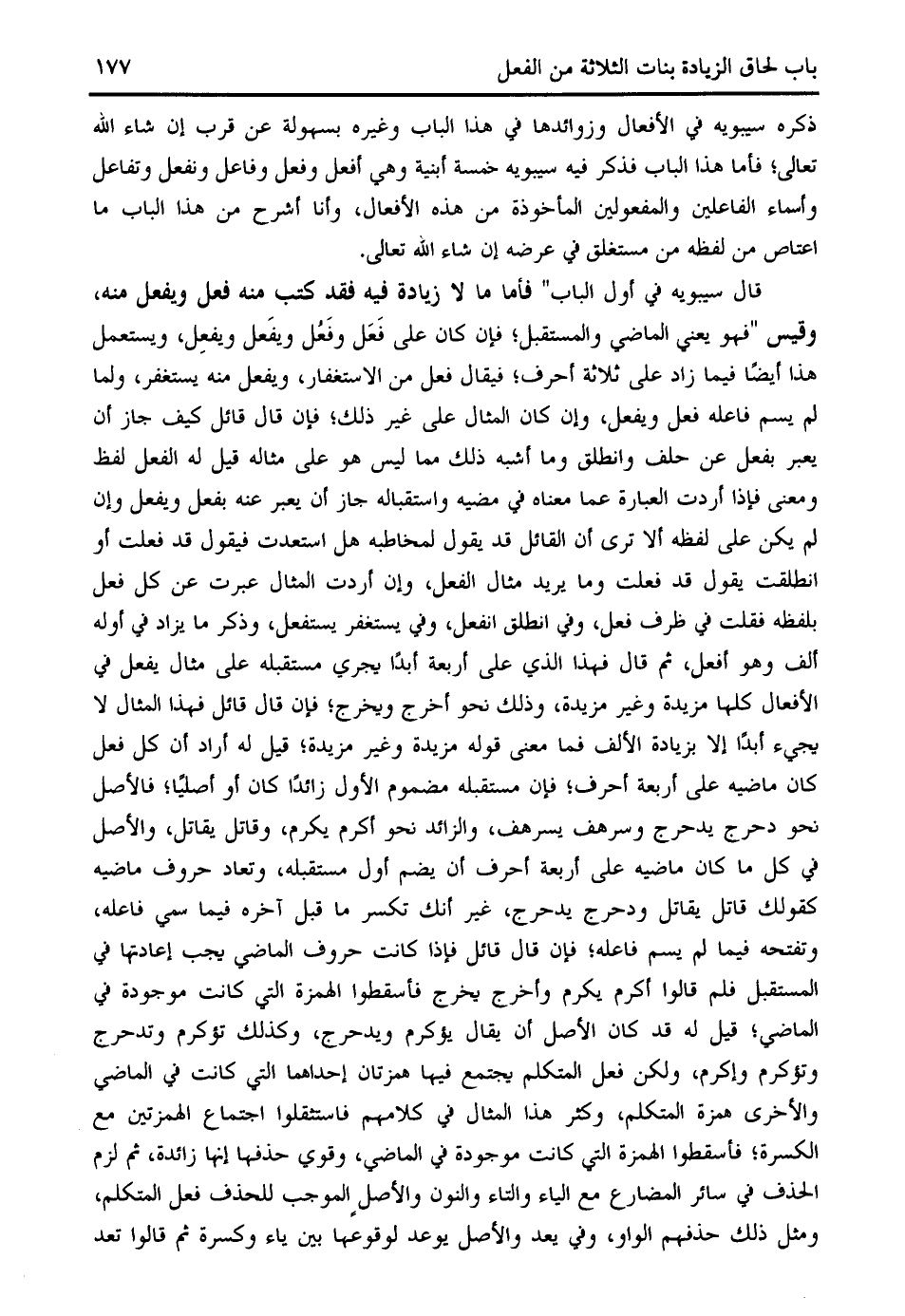 العبارة عما معناه في مضيه واستقباله جاز أن يعبر عنه بفعل ويفعل وإن لم يكن على لفظه ألا ترى أن القائل قد يقول لمخاطبه هل استعدت فيقول قد فعلت أو انطلقت يقول قد فعلت وما يريد مثال الفعل، وإن أردت المثال عبرت عن كل فعل بلفظه فقلت في ظرف فعل، وفي انطلق انفعل، وفي يستغفر يستفعل، وذكر ما يزاد في أوله ألف وهو أفعل، ثم قال فهذا الذي على أربعة أبدا يجري مستقبله على مثال يفعل في الأفعال كلها مزيدة وغير مزيدة، وذلك نحو أخرج ويخرج؛ فإن قال قائل فهذا المثال لا يجيء أبدا إلا بزيادة الألف فما معنى قوله مزيدة وغير مزيدة؛ قيل له أراد أن كل فعل كان ماضيه على أربعة أحرف؛ فإن مستقبله مضموم الأول زائدا كان أو أصليا؛ فالأصل نحو دحرج يدحرج وسرهف يسرهف، والزائد نحو أكرم يكرم، وقاتل يقاتل، والأصل في كل ما كان ماضيه على أربعة أحرف أن يضم أول مستقبله، وتعاد حروف ماضيه كقولك قاتل يقاتل ودحرج يدحرج، غير أنك تكسر ما قبل آخره فيما سمي فاعله، وتفتحه فيما لم يسم فاعله؛ فإن قال قائل فإذا كانت حروف الماضي يجب إعادتها في المستقبل فلم قالوا أكرم يكرم وأخرج يخرج فأسقطوا الهمزة التي كانت موجودة في الماضي؛ قيل له قد كان الأصل أن يقال يؤكرم ويدحرج، وكذلك تؤكرم وتدحرج وتؤكرم وإكرم، ولكن فعل المتكلم يجتمع فيها همزتان إحداهما التي كانت في الماضي والأخرى همزة المتكلم، وكثر هذا المثال في كلامهم فاستثقلوا اجتماع الهمزتين مع الكسرة؛ فأسقطوا الهمزة التي كانت موجودة في الماضي، وقوي حذفها إنها زائدة، ثم لزم الحذف في سائر المضارع مع الياء والتاء والنون والأصل الموجب للحذف فعل المتكلم، ومثل ذلك حذفهم الواو، وفي يعد والأصل يوعد لوقوعها بين ياء وكسرة ثم قالوا تعد