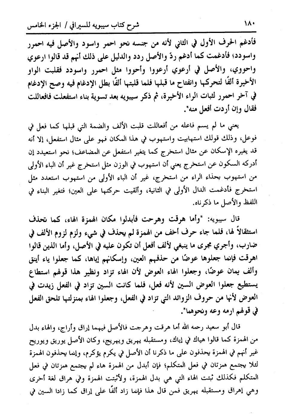 قال أبو سعيد رحمه الله أما هرقت وهرجت فالأصل فيهما إراق وأراج، والهاء بدل من الهمزة كما قالوا هياك في إياك، ومستقبله يهريق ويهريج، وكان الأصل يوريق ويوريح غير أنهم في الهمزة يحذفون على ما ذكرنا أن الأصل في يكرم يؤكرم، وإنما يحذفون الهمزة لئلا يجتمع همزتان في فعل المتكلم؛ فإن أبدل من الهمزة هاء لم يجتمع همزتان في فعل المتكلم فكذلك ثبتت الهاء التي هي بدل الهمزة، ولأثبتت الهمزة وفي هراق لغة أخرى وهي إهراق ومستقبله يهريق فمن قال هذا فإنما زاد ألفا على إراق كما زادا السين في