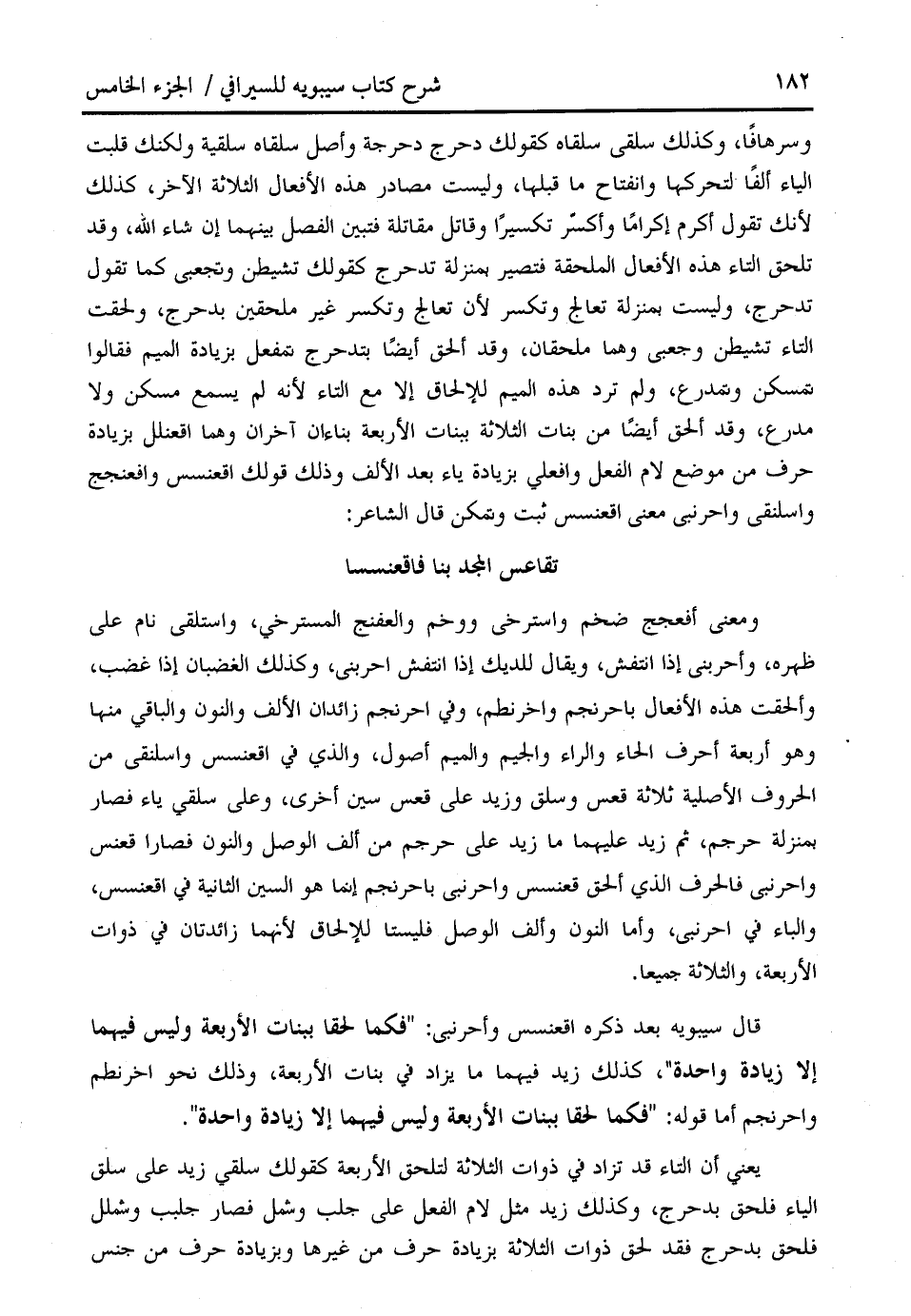 ومعنى أفعجج ضخم واسترخى ووخم والعفنج المسترخي، واستلقى نام على ظهره، وأحربني إذا انتفش، ويقال للديك إذا انتفش احربني، وكذلك الغضبان إذا غضب، وألحقت هذه الأفعال باحرنجم واخرنطم، وفي احرنجم زائدان الألف والنون والباقي منها وهو أربعة أحرف الحاء والراء والجيم والميم أصول، والذي في اقعنسس واسلنقى من الحروف الأصلية ثلاثة قعس وسلق وزيد على قعس سين أخرى، وعلى سلقي ياء فصار بمنزلة حرجم، ثم زيد عليهما ما زيد على حرجم من ألف الوصل والنون فصارا قعنس واحرنبى فالحرف الذي ألحق قعنسس واحرنبى باحرنجم إنما هو السين الثانية في اقعنسس، والباء في احرنبي، وأما النون وألف الوصل فليستا للإلحاق لأنهما زائدتان في ذوات الأربعة، والثلاثة جميعا.