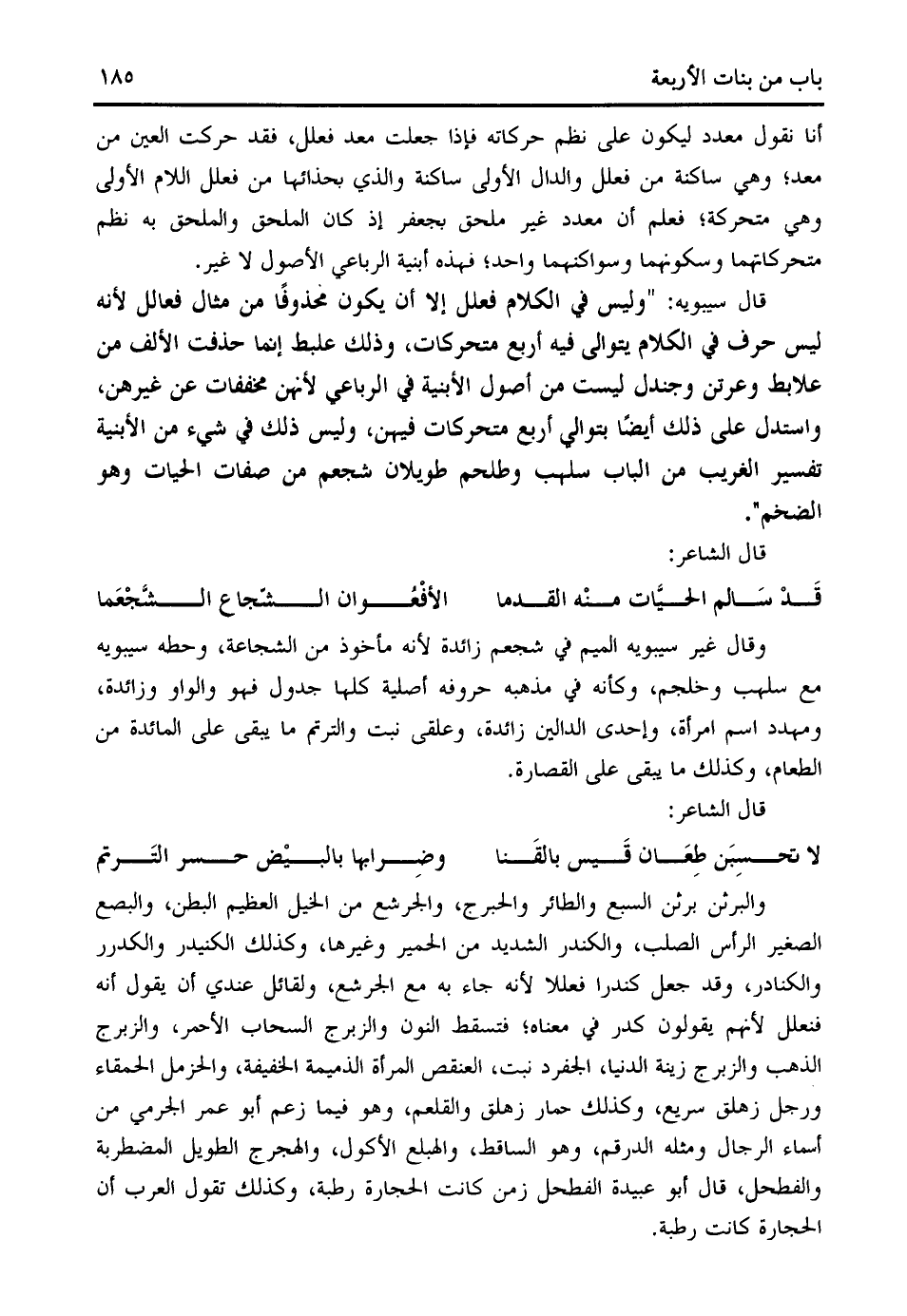 أنا نقول معدد ليكون على نظم حركاته فإذا جعلت معد فعلل، فقد حركت العين من معد؛ وهي ساكنة من فعلل والدال الأولى ساكنة والذي بحذائها من فعلل اللام الأولى وهي متحركة؛ فعلم أن معدد غير ملحق بجعفر إذ كان الملحق والملحق به نظم متحركاتهما وسكونهما وسواكنهما واحد؛ فهذه أبنية الرباعي الأصول لا غير.