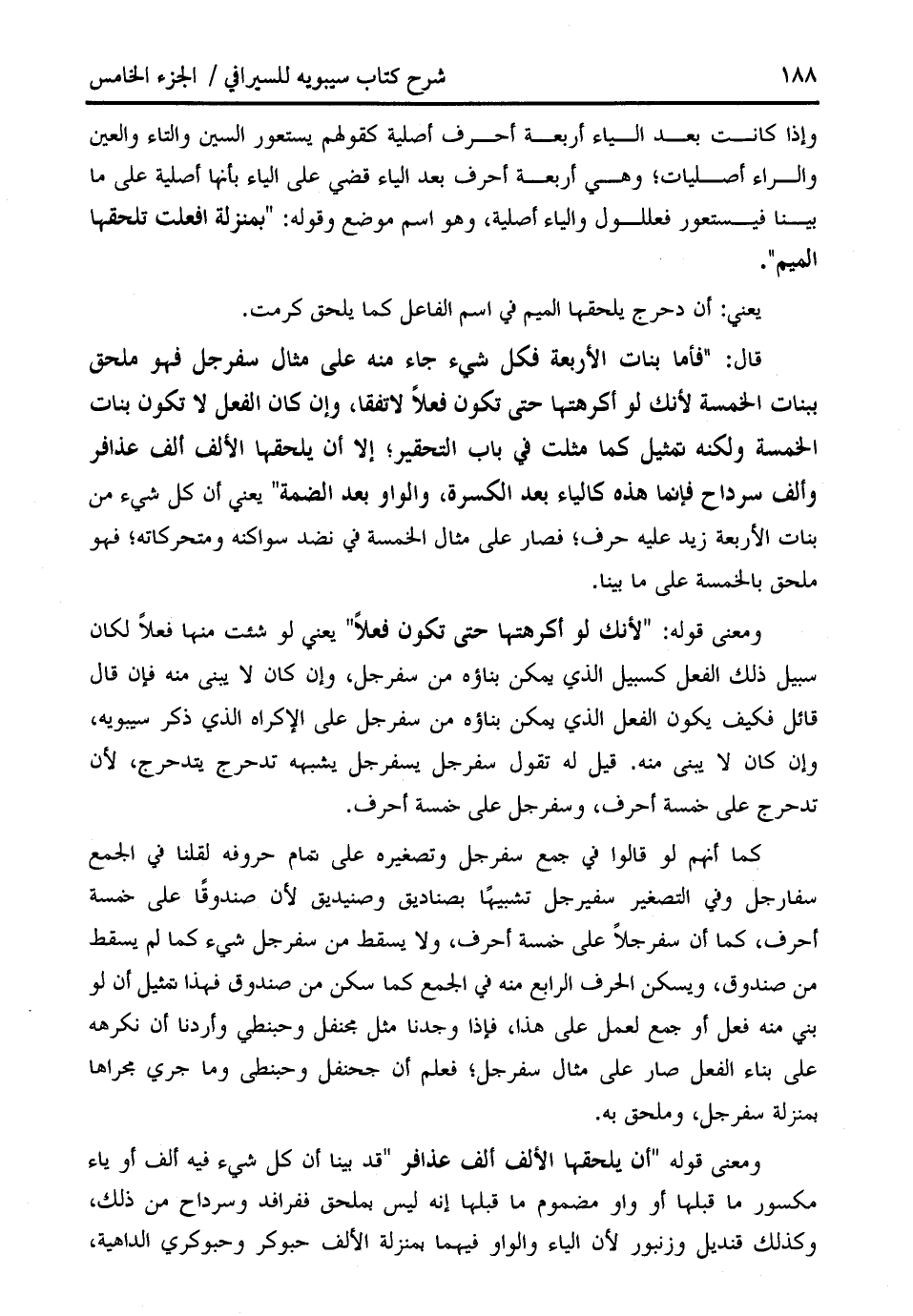 كما أنهم لو قالوا في جمع سفرجل وتصغيره على تمام حروفه لقلنا في الجمع سفارجل وفي التصغير سفيرجل تشبيها بصناديق وصنيديق لأن صندوقا على خمسة أحرف، كما أن سفرجلا على خمسة أحرف، ولا يسقط من سفرجل شيء كما لم يسقط من صندوق، ويسكن الحرف الرابع منه في الجمع كما سكن من صندوق فهذا تمثيل أن لو بني منه فعل أو جمع لعمل على هذا، فإذا وجدنا مثل مجنفل وحبنطي وأردنا أن نكرهه على بناء الفعل صار على مثال سفرجل؛ فعلم أن جحنفل وحبنطى وما جري مجراها بمنزلة سفرجل، وملحق به.
