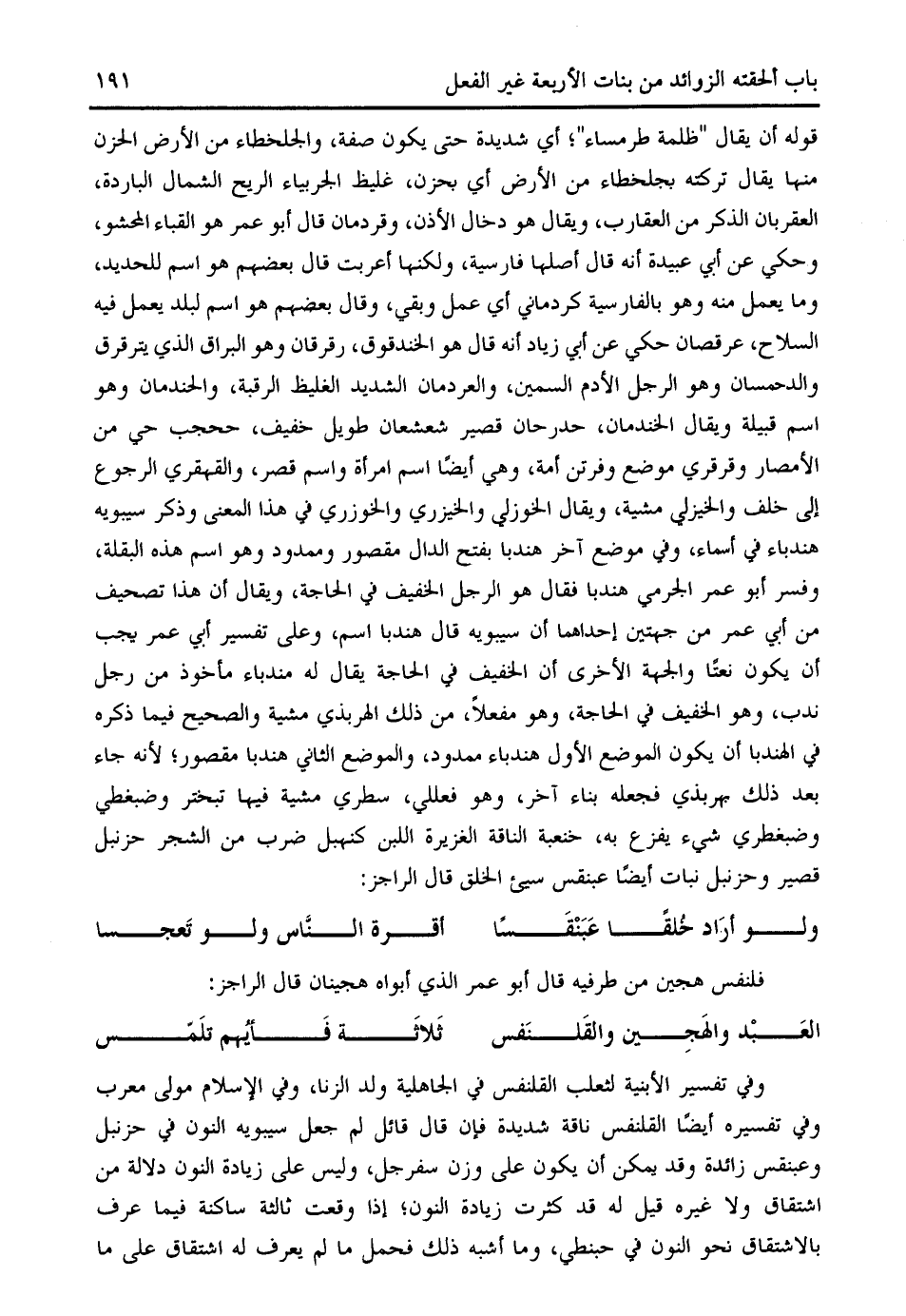 قوله أن يقال " ظلمة طرمساء "؛ أي شديدة حتى يكون صفة، والجلخطاء من الأرض الحزن منها يقال تركته بجلخطاء من الأرض أي بحزن، غليظ الجربياء الريح الشمال الباردة، العقربان الذكر من العقارب، ويقال هو دخال الأذن، وقردمان قال أبو عمر هو القباء المحشو، وحكي عن أبي عبيدة أنه قال أصلها فارسية، ولكنها أعربت قال بعضهم هو اسم للحديد، وما يعمل منه وهو بالفارسية كردماني أي عمل وبقي، وقال بعضهم هو اسم لبلد يعمل فيه السلاح، عرقصان حكي عن أبي زياد أنه قال هو الخندقوق، رقرقان وهو البراق الذي يترقرق والدحمسان وهو الرجل الأدم السمين، والعردمان الشديد الغليظ الرقبة، والحندمان وهو اسم قبيلة ويقال الخندمان، حدرحان قصير شعشعان طويل خفيف، ححجب حي من الأمصار وقرقري موضع وفرتن أمة، وهي أيضا اسم امرأة واسم قصر، والقهقري الرجوع إلى خلف والخيزلي مشية، ويقال الخوزلي والخيزري والخوزري في هذا المعنى وذكر سيبويه هندباء في أسماء، وفي موضع آخر هندبا بفتح الدال مقصور وممدود وهو اسم هذه البقلة، وفسر
