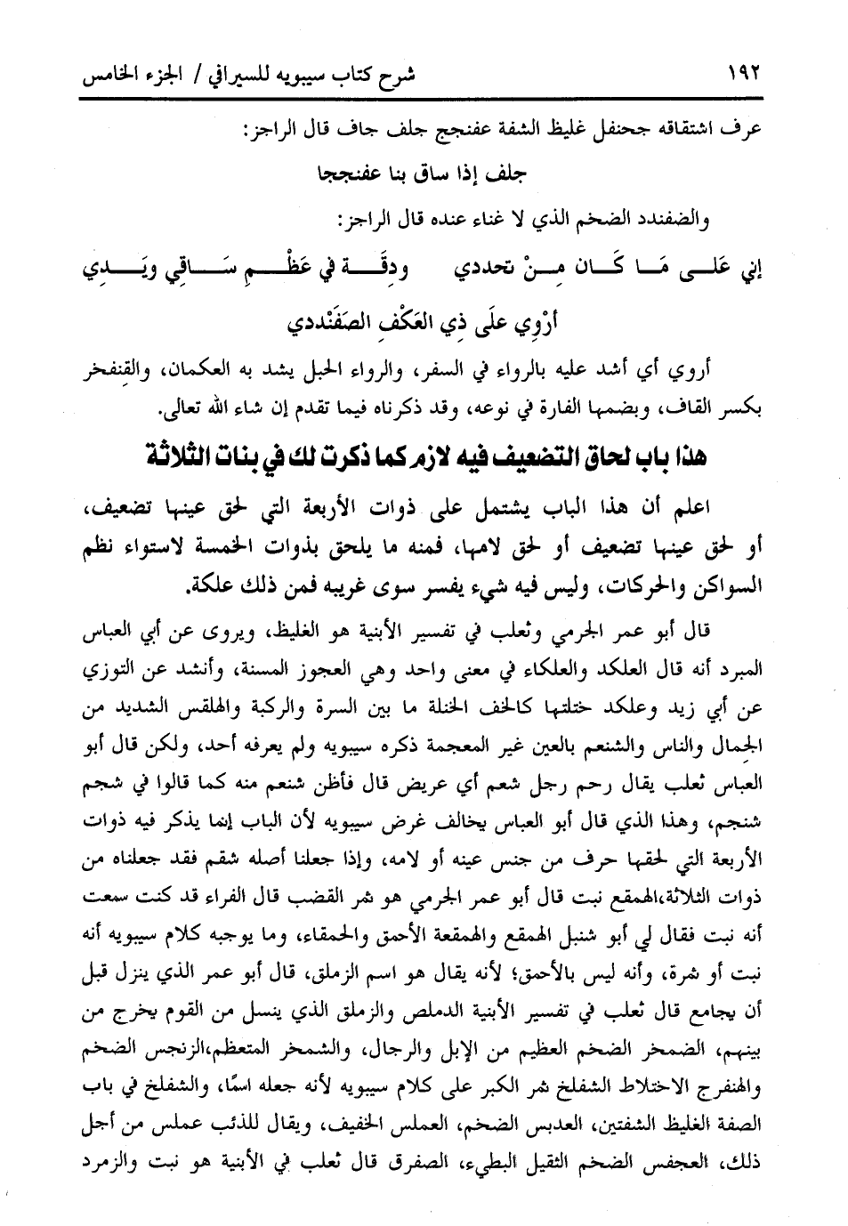 قال أبو عمر الجرمي وثعلب في تفسير الأبنية هو الغليظ، ويروى عن أبي العباس المبرد أنه قال العلكد والعلكاء في معنى واحد وهي العجوز المسنة، وأنشد عن التوزي عن أبي زيد وعلكد ختلتها كالخف الخنلة ما بين السرة والركبة والهلقس الشديد من الجمال والناس والشنعم بالعين غير المعجمة ذكره سيبويه ولم يعرفه أحد، ولكن قال أبو العباس ثعلب يقال رحم رجل شعم أي عريض قال فأظن شنعم منه كما قالوا في شجم شنجم، وهذا الذي قال أبو العباس يخالف غرض سيبويه لأن الباب إنما يذكر فيه ذوات الأربعة التي لحقها حرف من جنس عينه أو لامه، وإذا جعلنا أصله شقم فقد جعلناه من ذوات الثلاثة، الهمقع نبت قال أبو عمر الجرمي هو ثمر القضب قال الفراء قد كنت سمعت أنه نبت فقال لي أبو شنبل الهمقع والهمقعة الأحمق والحمقاء، وما يوجبه كلام سيبويه أنه نبت أو ثمرة، وأنه ليس بالأحمق؛ لأنه يقال هو اسم الزملق، قال أبو عمر الذي ينزل قبل أن يجامع قال ثعلب في تفسير الأبنية الدملص والزملق الذي ينسل من القوم يخرج من بينهم، الضمخر الضخم العظيم من الإبل والرجال، والشمخر المتعظم، الزنجس الضخم والهنفرج الاختلاط الشفلخ ثمر الكبر على كلام سيبويه لأنه جعله اسما، والشفلخ في باب الصفة الغليظ الشفتين، العدبس الضخم، العملس الخفيف، ويقال للذئب عملس من أجل ذلك، العجفس الضخم الثقيل البطيء، الصفرق قال ثعلب في الأبنية هو نبت والزمرد