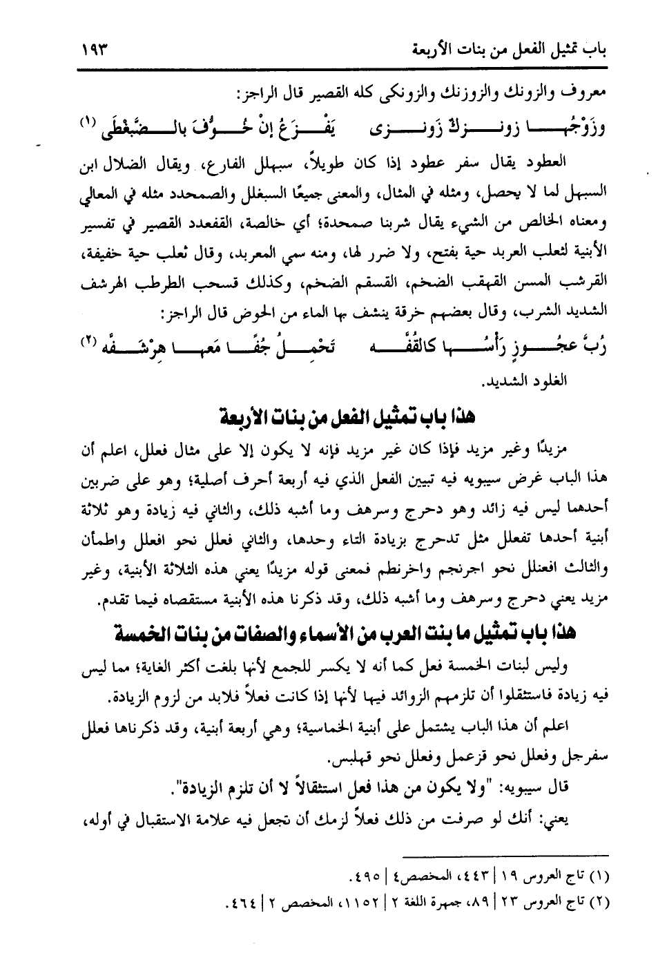 اعلم أن هذا الباب يشتمل على أبنية الخماسية؛ وهي أربعة أبنية، وقد ذكرناها فعلل سفرجل وفعلل نحو قزعمل وفعلل نحو قهلبس.